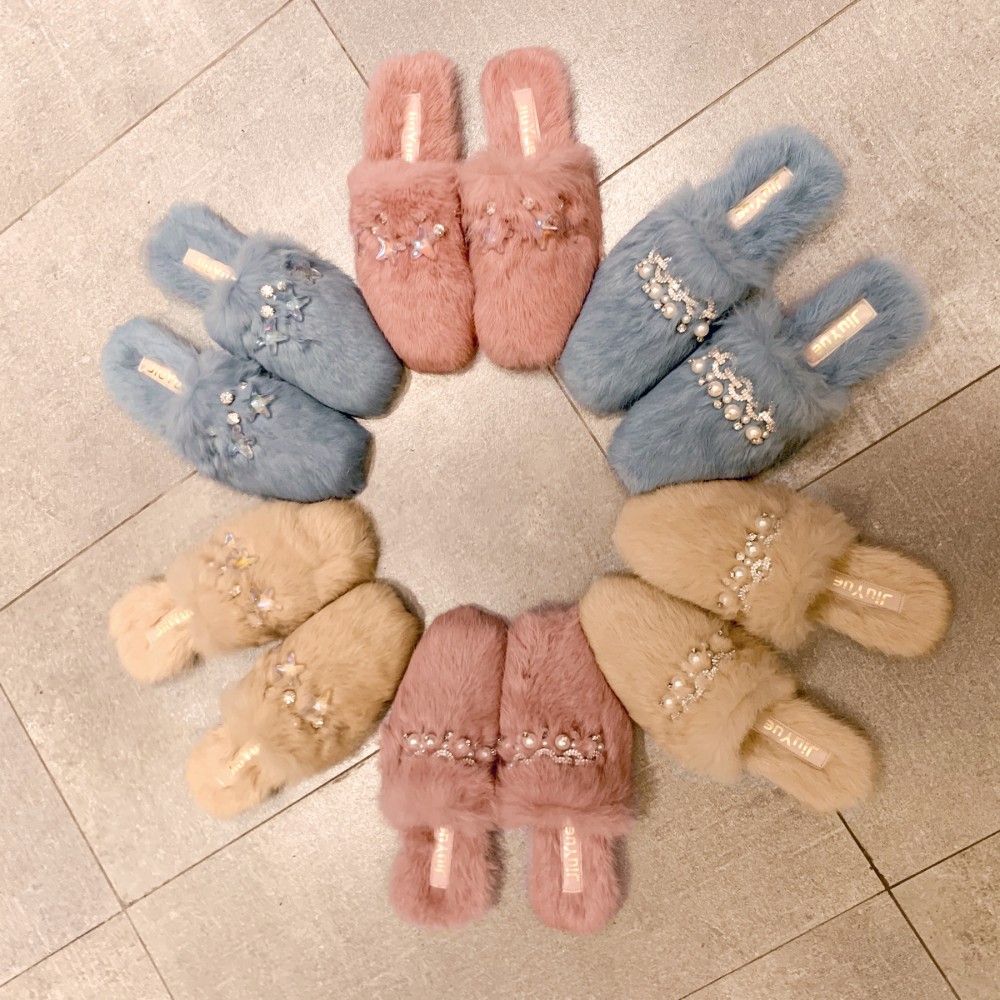 All true rabbit fur shoes autumn and winter new wild diamond pearl half drag