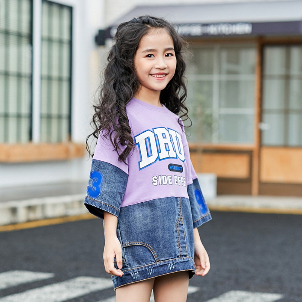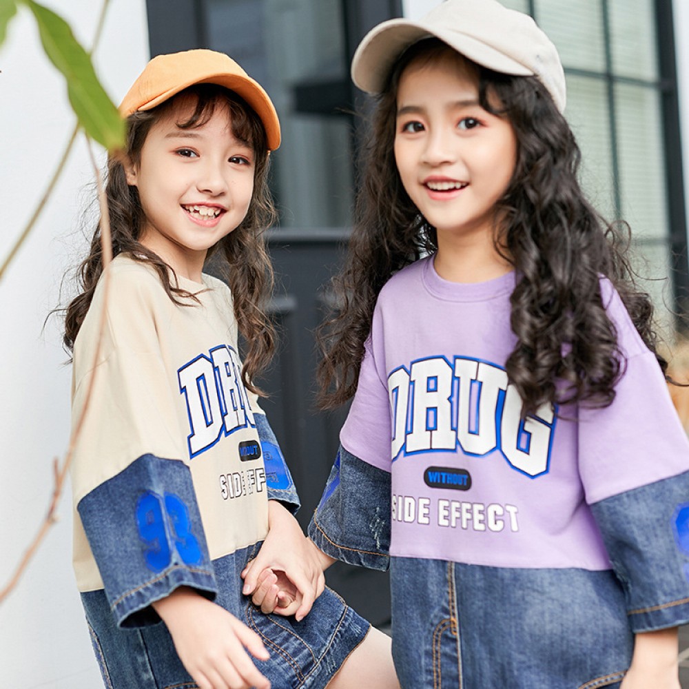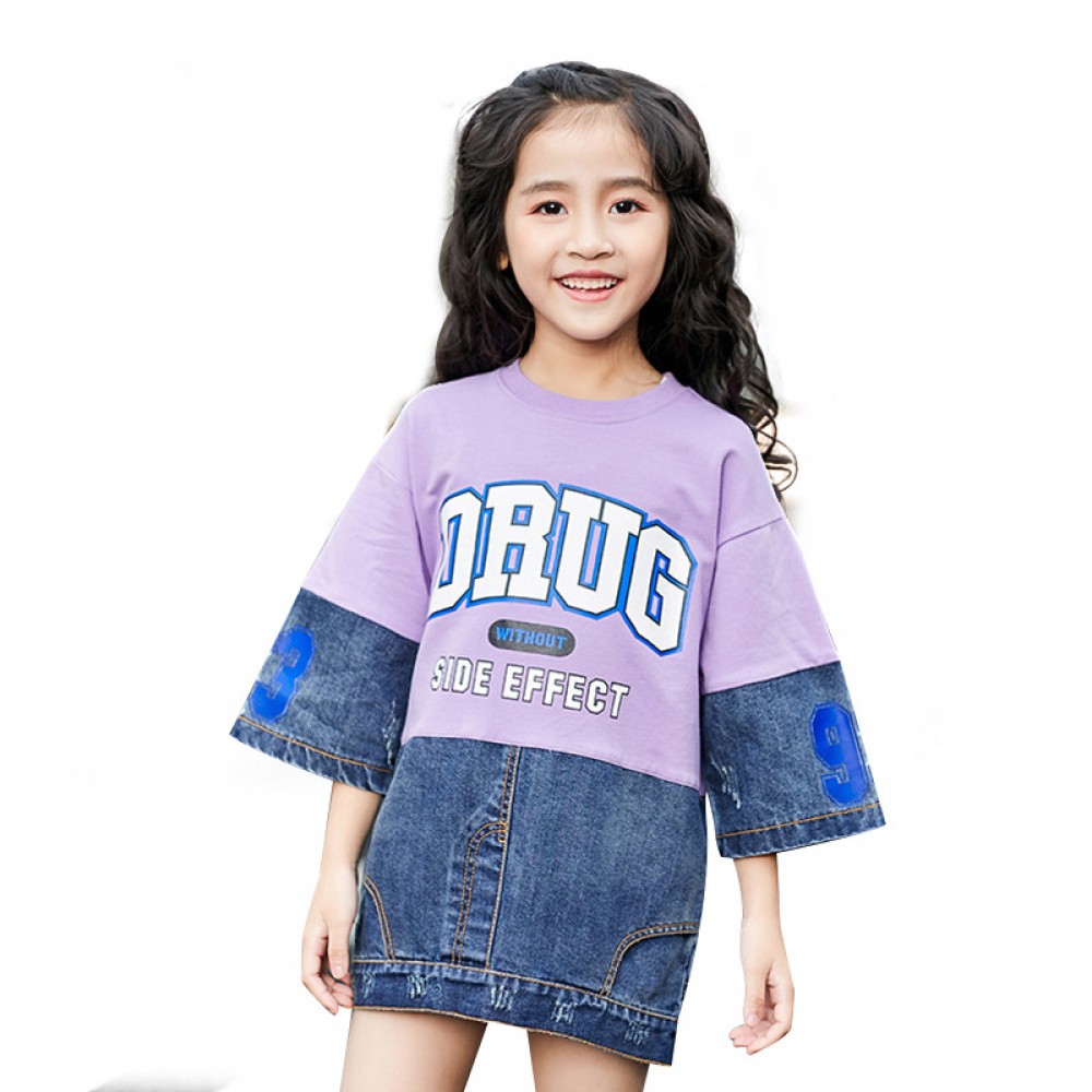 Children's clothing autumn girl T-shirt seven-point sleeve sleeve round neck stitching in the big boy denim jacket tide