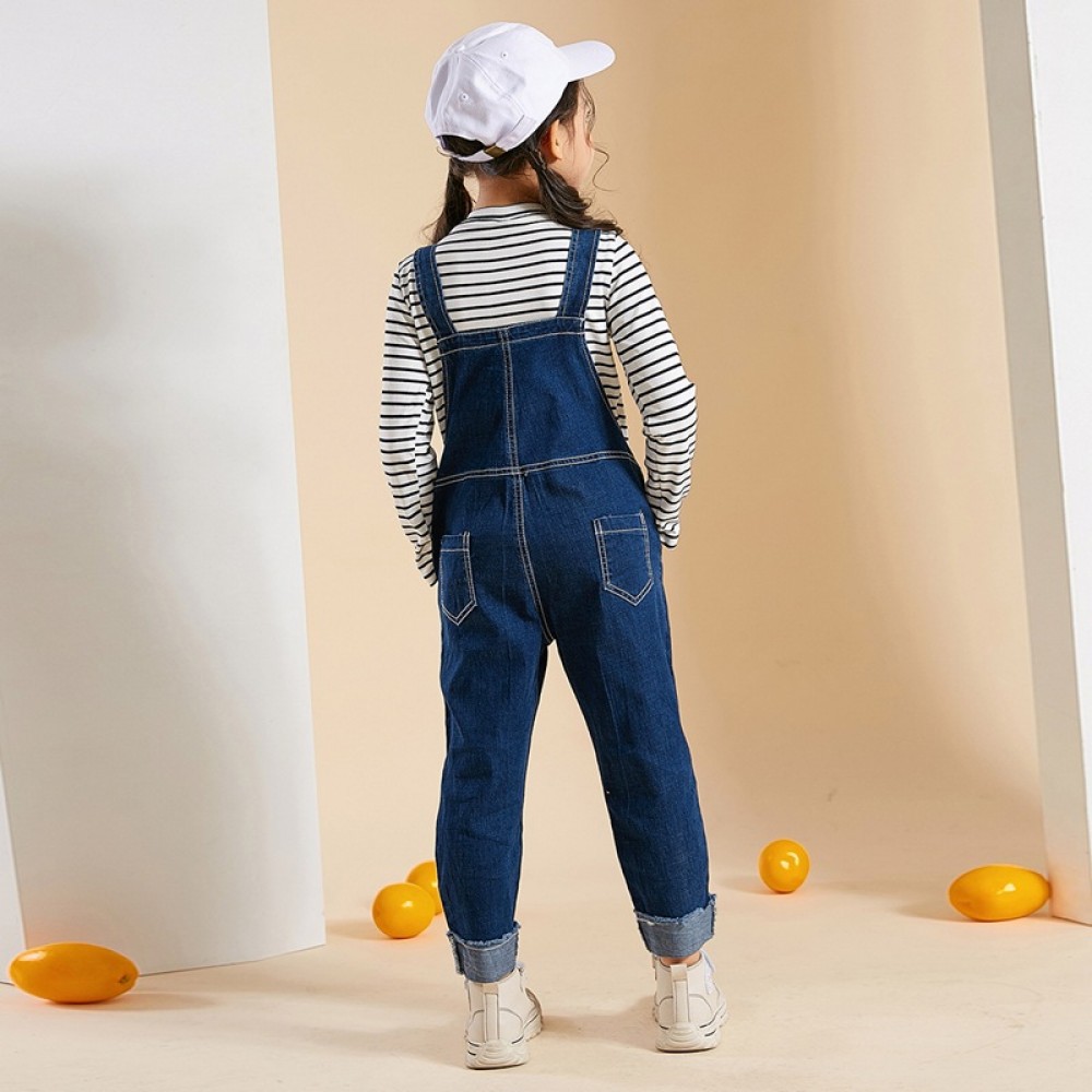 Children's clothing spring new girl's pants suit two-piece long-sleeved striped T-shirt denim suspenders tide