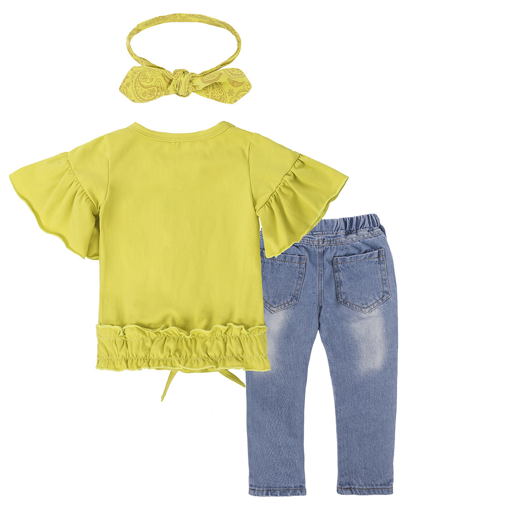 Children's clothing summer new girl trumpet sleeve letters yellow shirt balloon jeans hair accessories girls suit