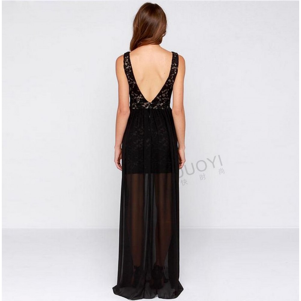 Deep summer v-neck lace stitching chiffon dress long skirt sexy dress