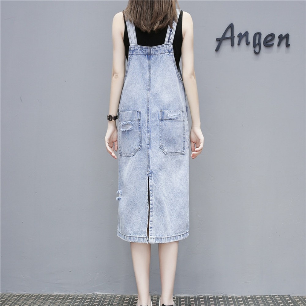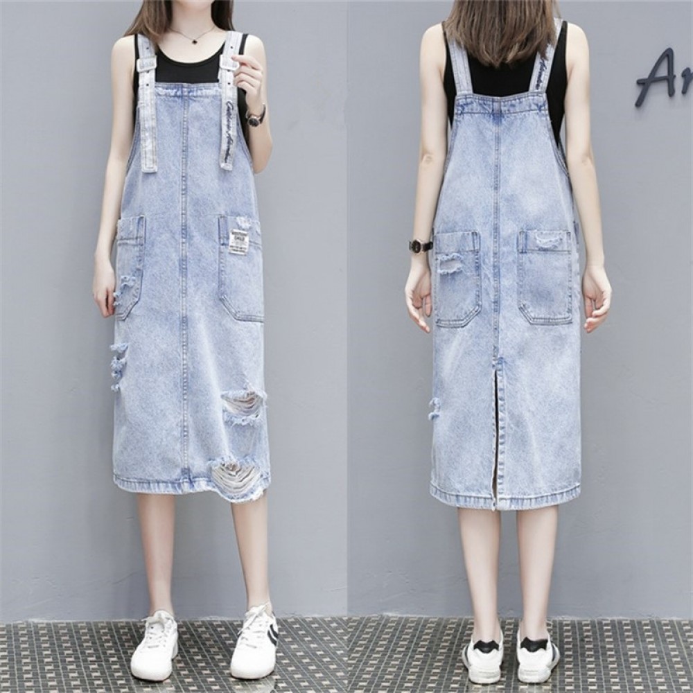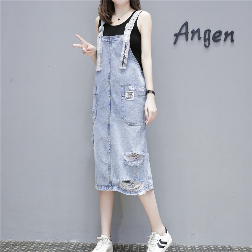 Denim strap dress women's summer new fashion hole denim dress wild thin dress