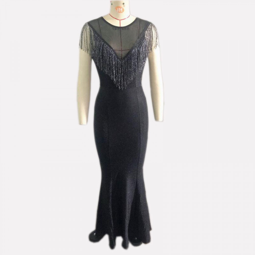 Edge trimmed contrast net yoke fishtail hem maxi tassel dress