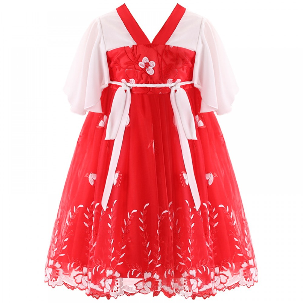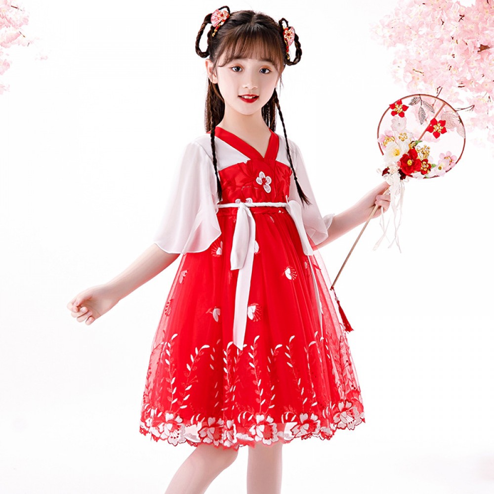 Girls' summer red festive children's hanbok cotton Chinese style embroidery short-sleeved middle-aged boy skirt