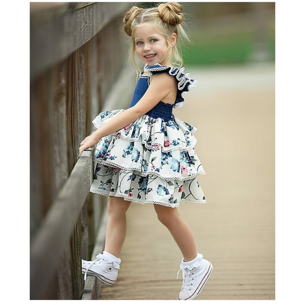 Girls print dress baby vest skirt small flying sleeve lace denim cake skirt