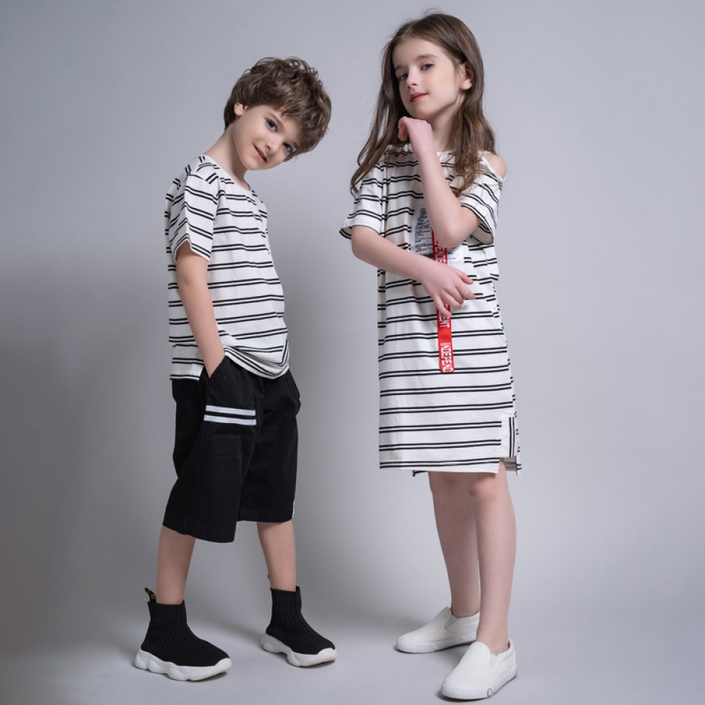 Girls striped straight off-the-shoulder skirts boys and girls round neck short sleeve summer children siblings