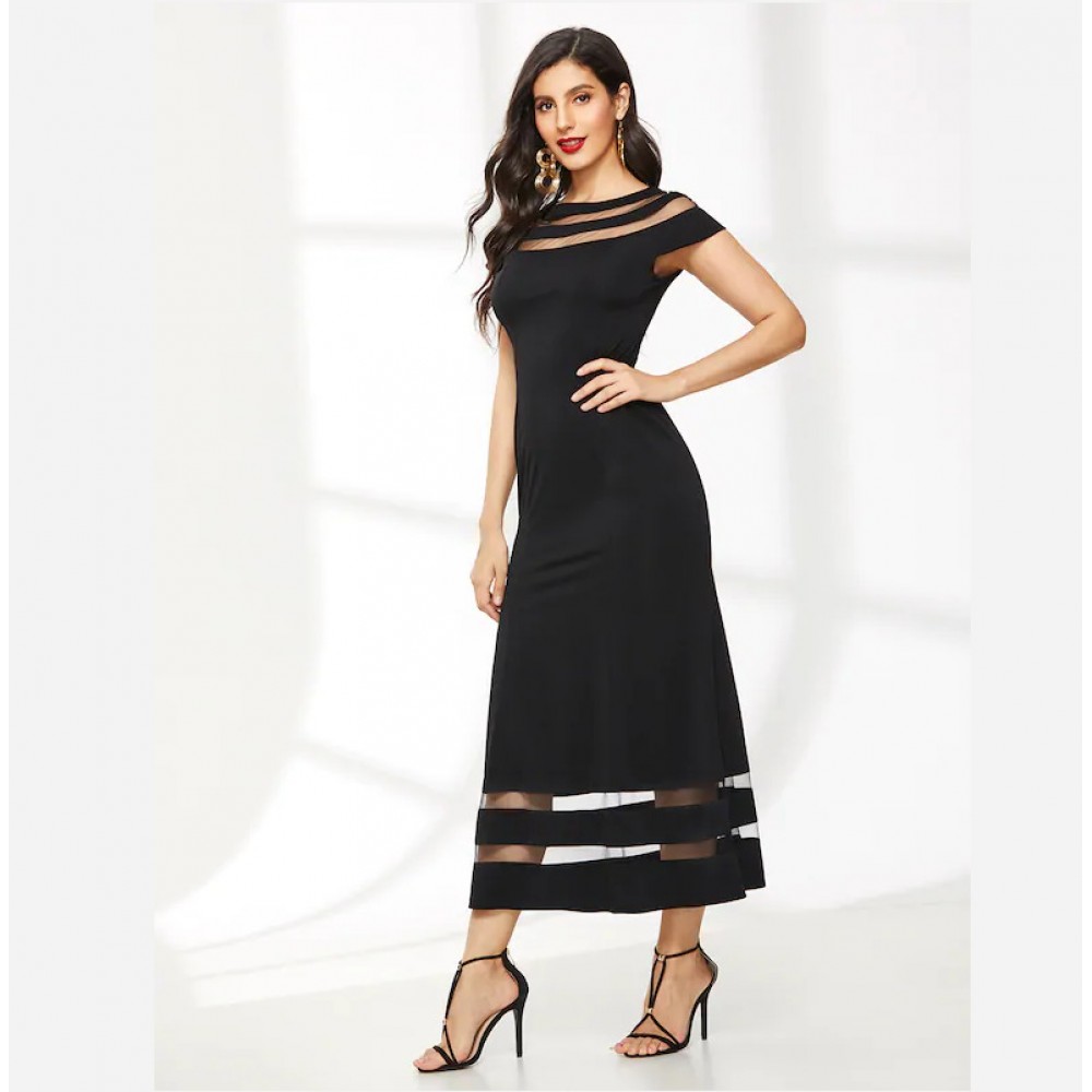 Hot sale women's round neck short sleeve mesh perspective solid color dress