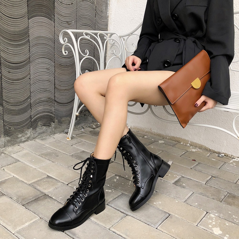 Martin boots women's new style wind leather short boots lace-up chunky heel medium boots