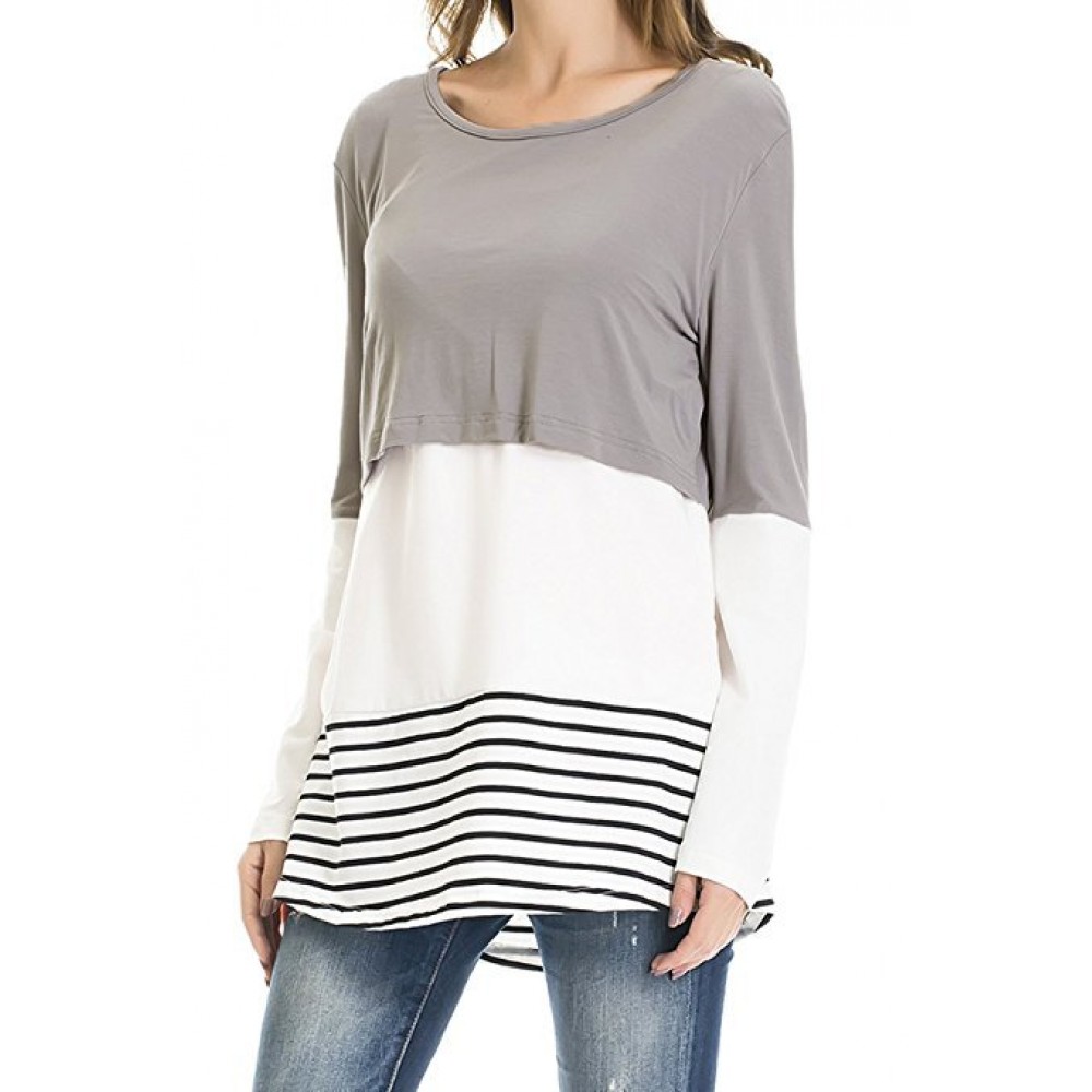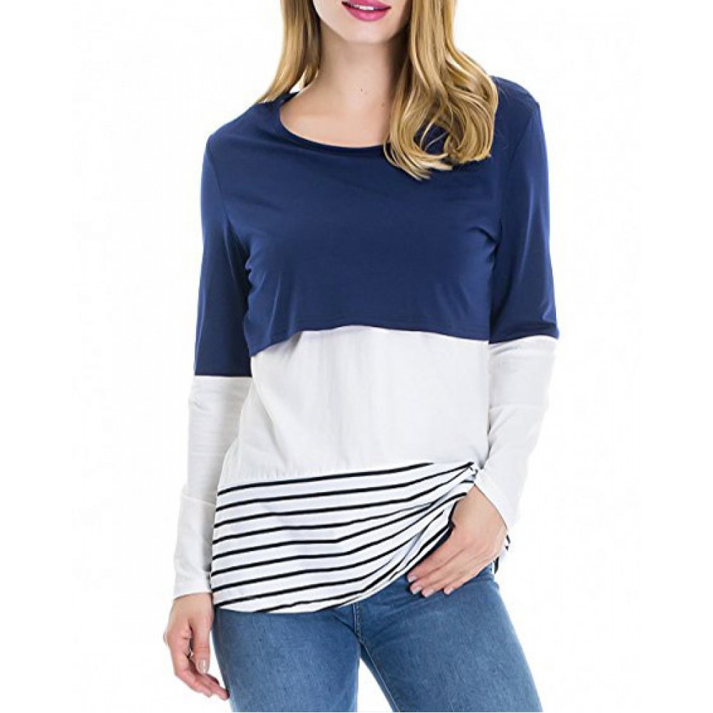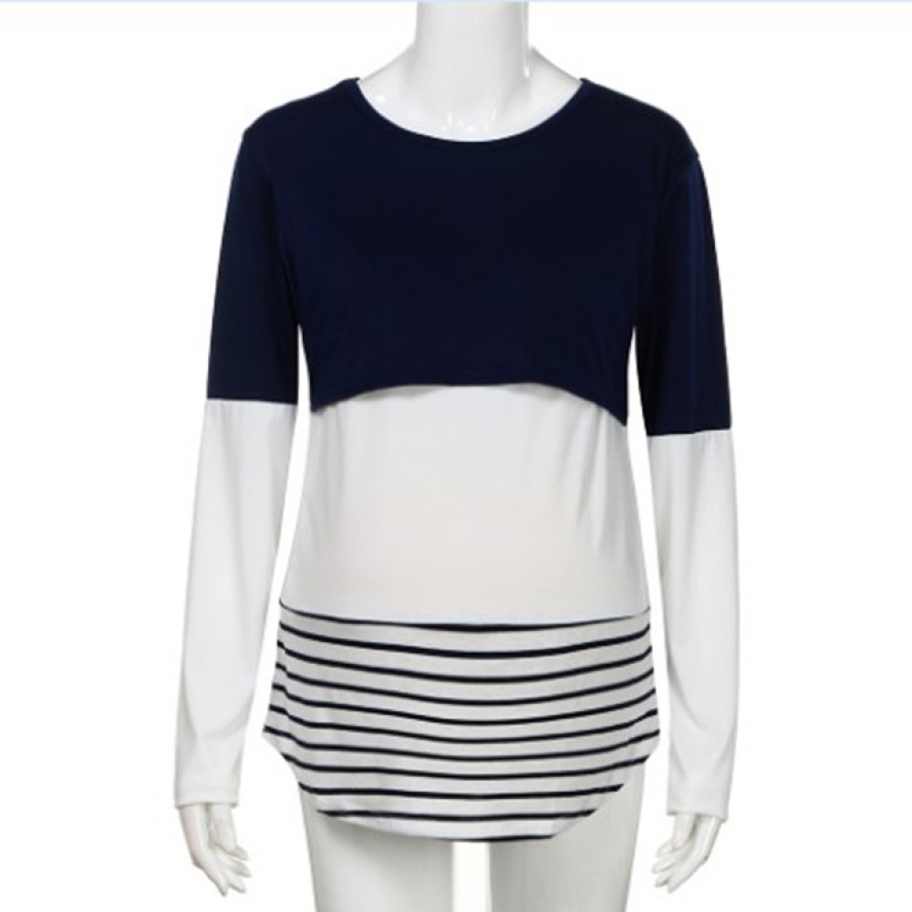 Maternity Wear Long Sleeves Round Collar Colorblock Lace Striped T-Shirt