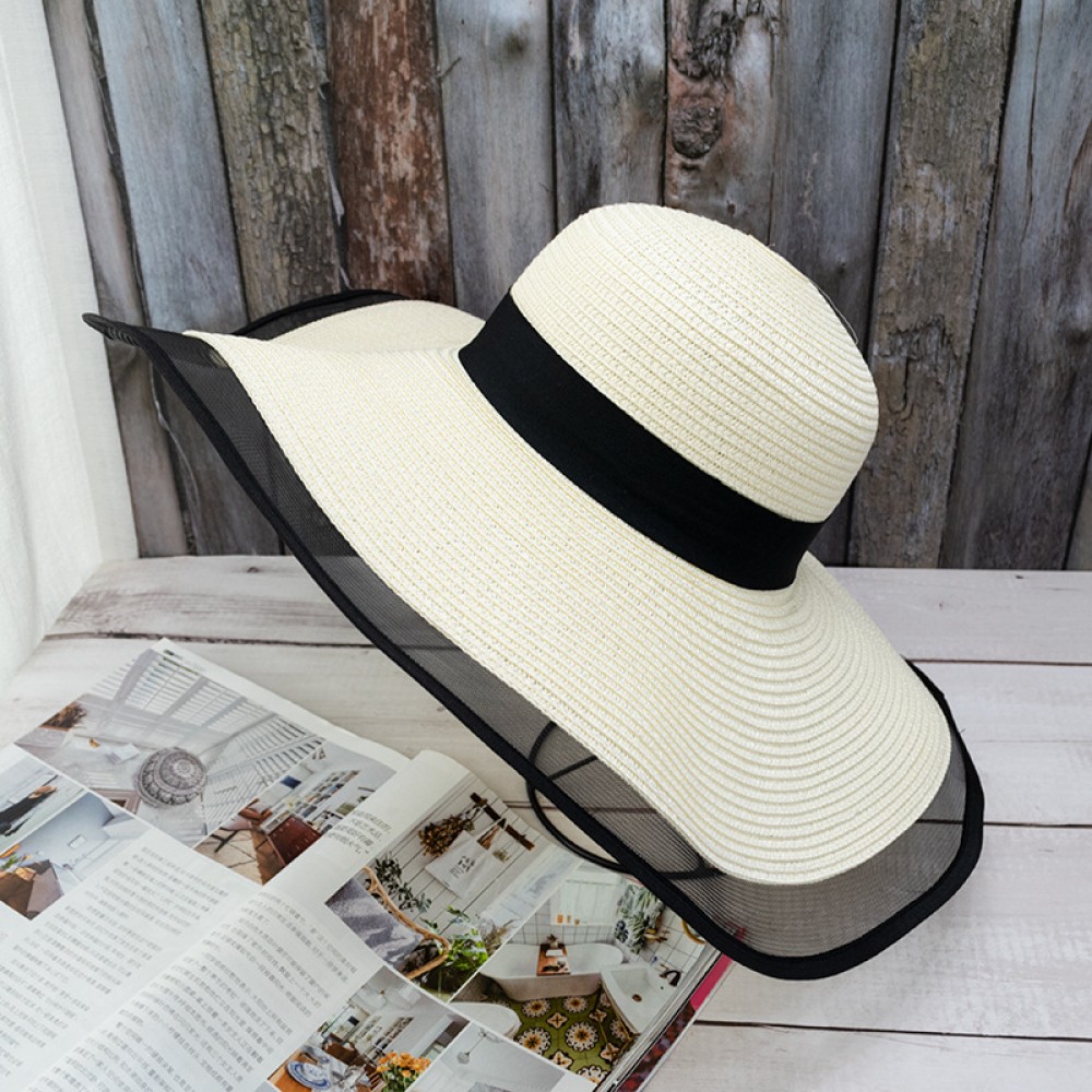 Mesh stitching Hepburn wind straw hat retro elegant dome sun hat summer sun protection shade beach hat