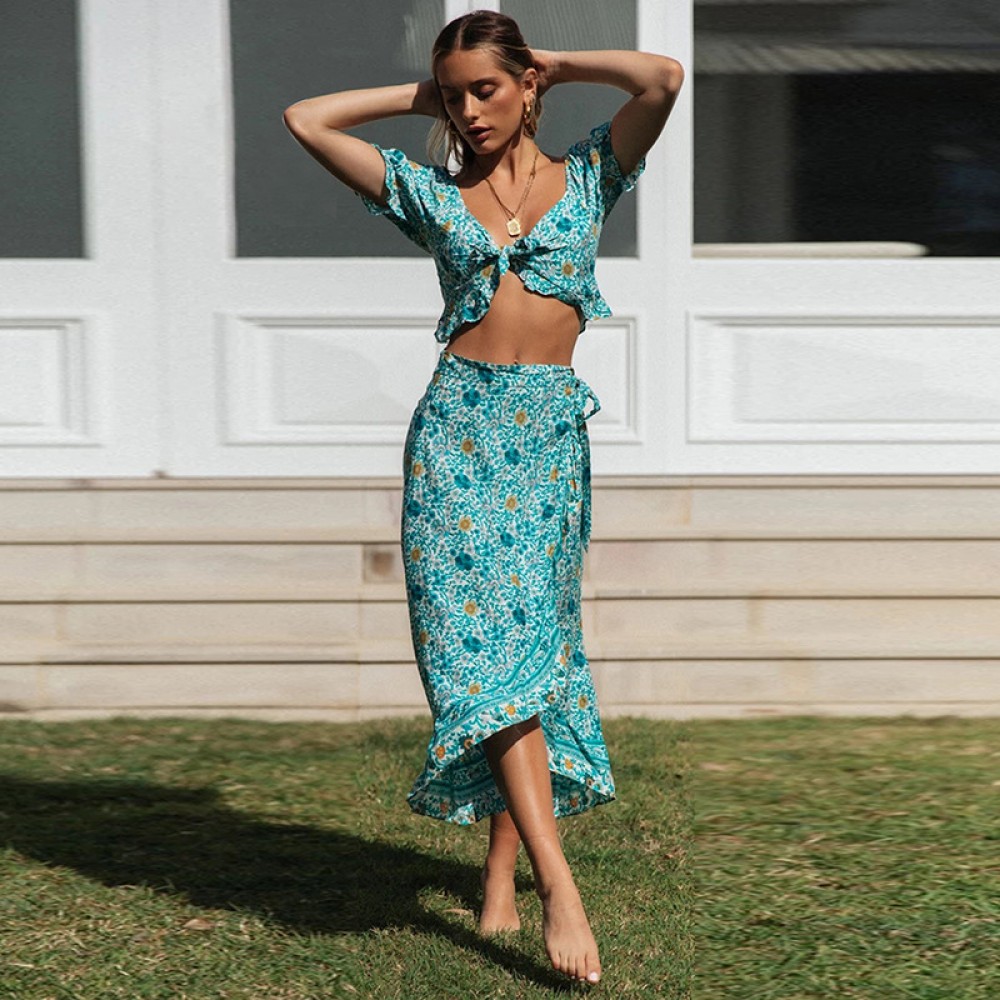 New bohemian holiday style irregular skirt short section exposed navel top two-piece suit
