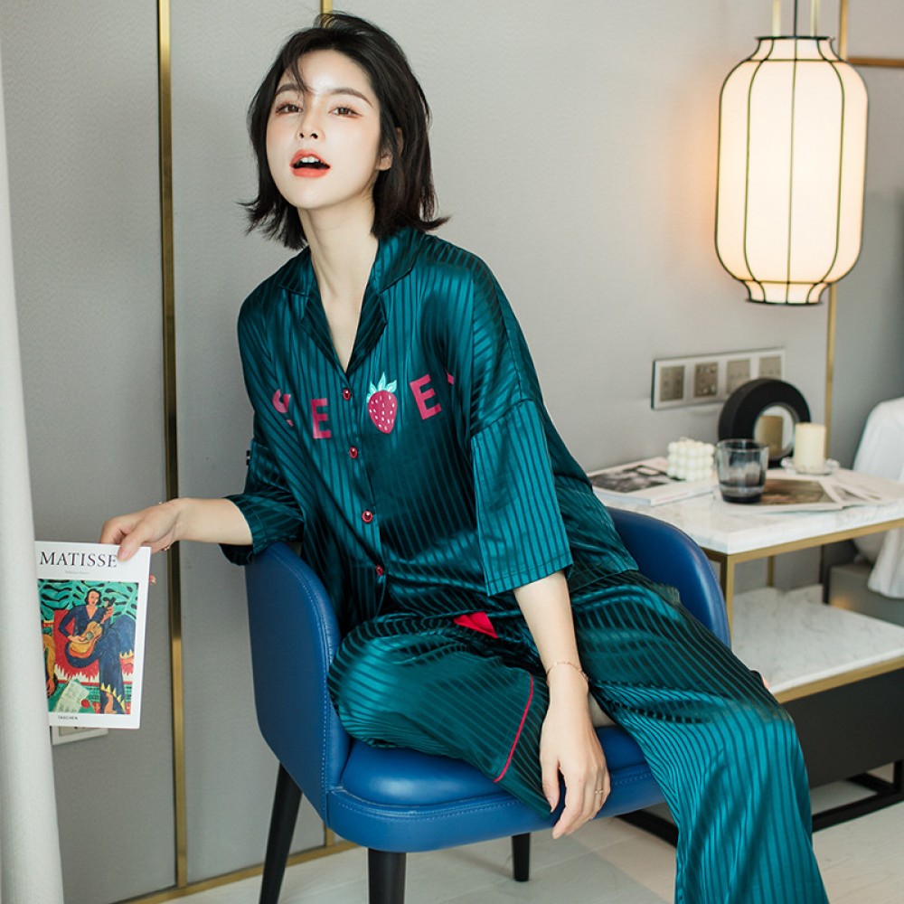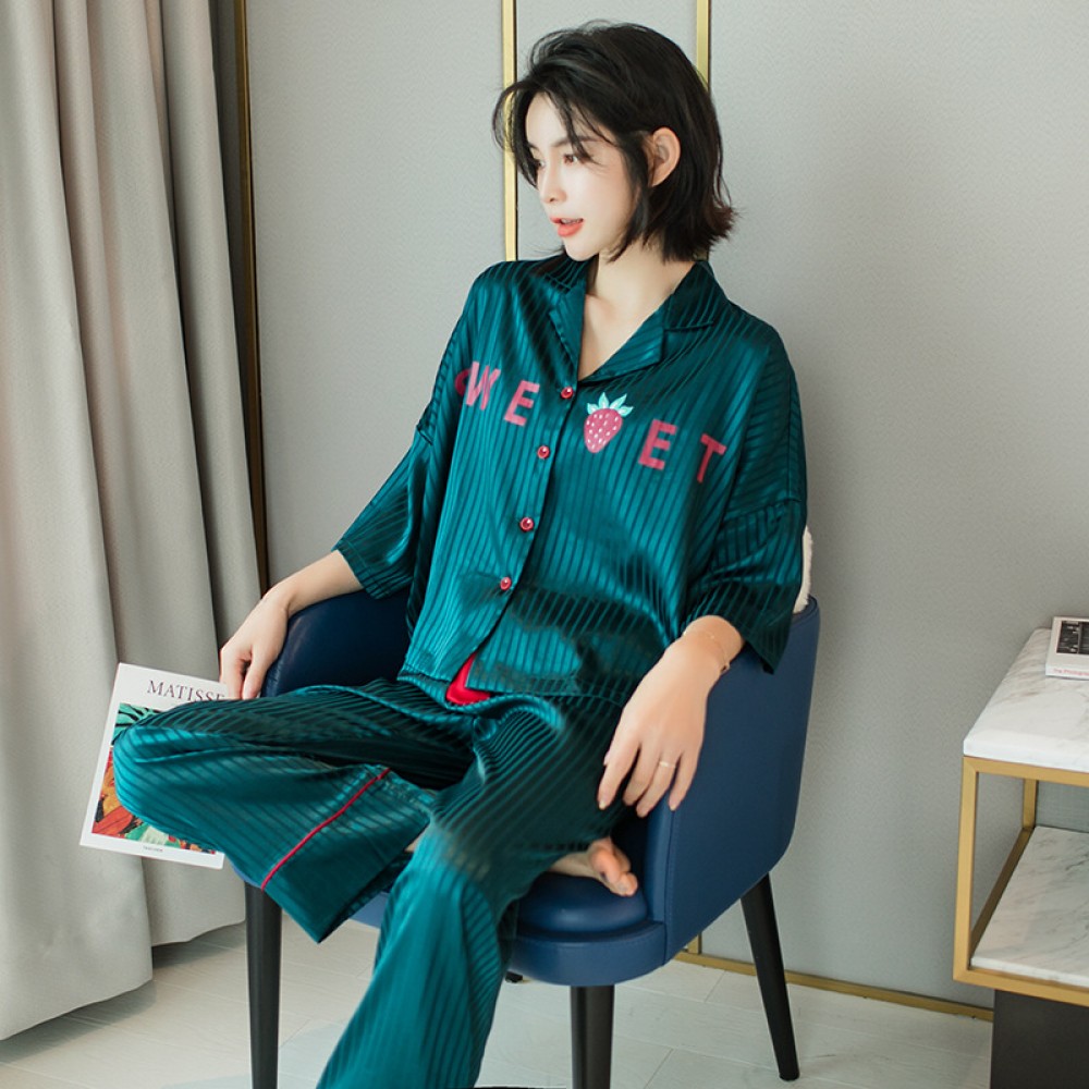 New ice silk pajamas ladies XL trend printing bat sleeves home service silk suit cute