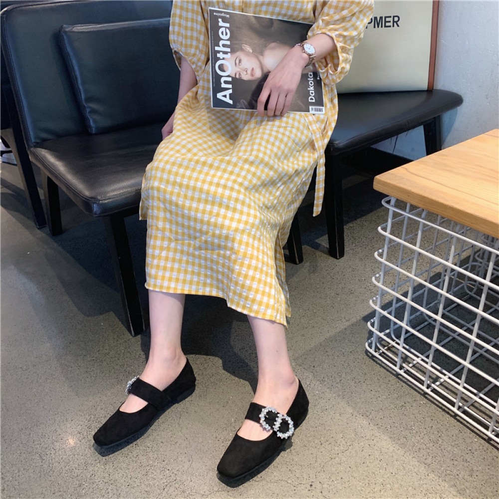 New single shoes square head flat bottom OL low heel single shoes rhinestone buckle suede lazy women's shoes