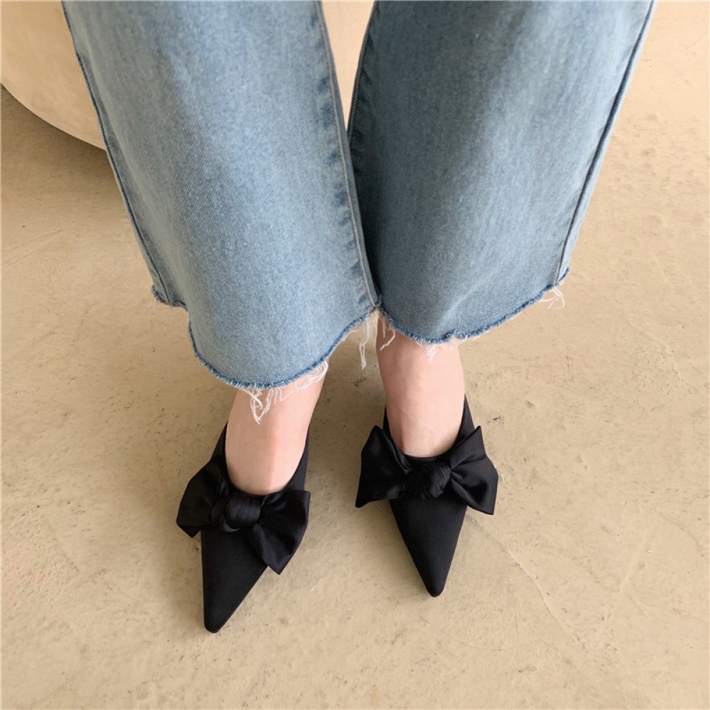 New spring bowknot pointed satin OL fine heel dress half slippers women