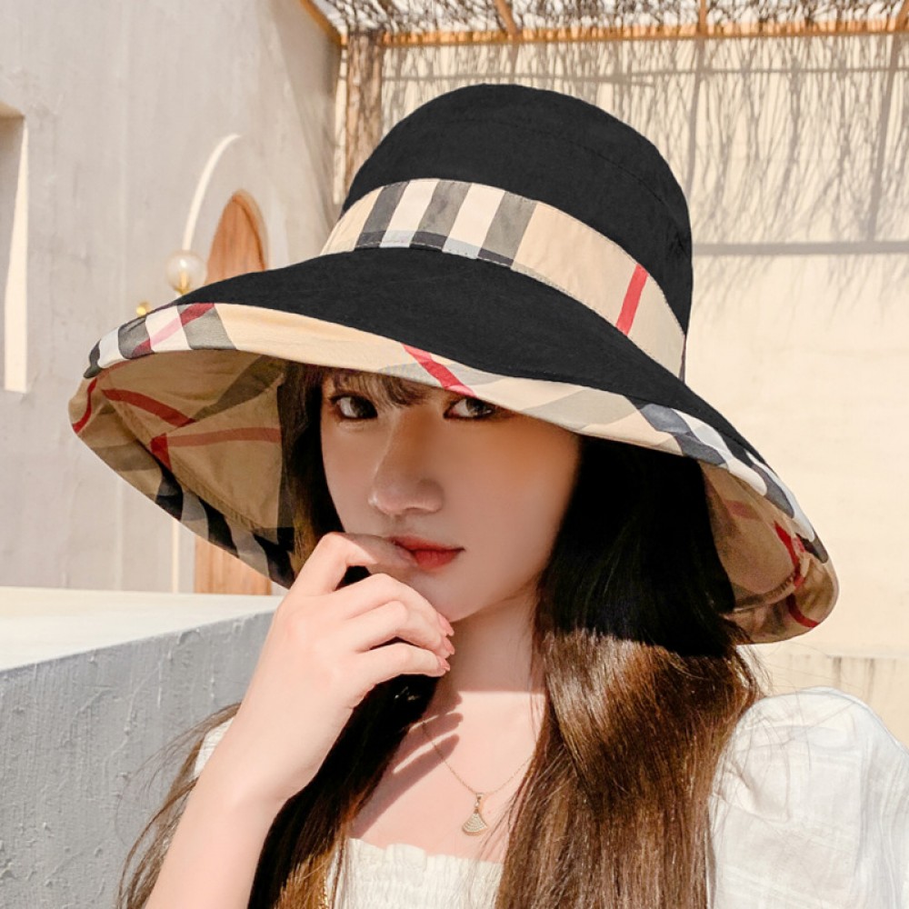 New style hat spring and summer female super large eaves fisherman hat contrast color lattice sun hat double-sided with sun hat travel