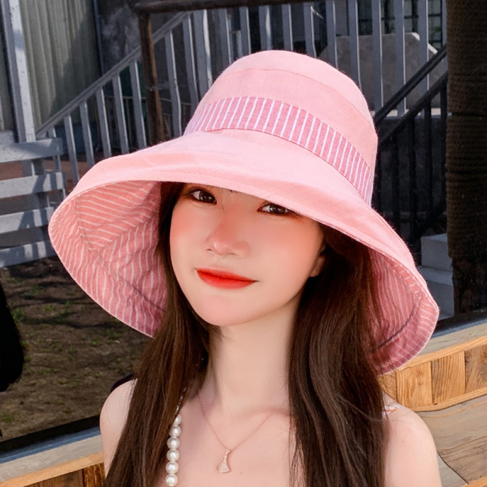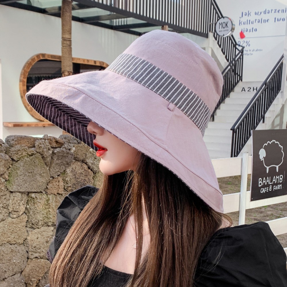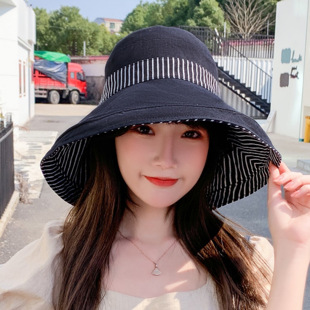 New style hat spring and summer female super large eaves fisherman hat contrast color striped sun hat double-sided with sun hat travel