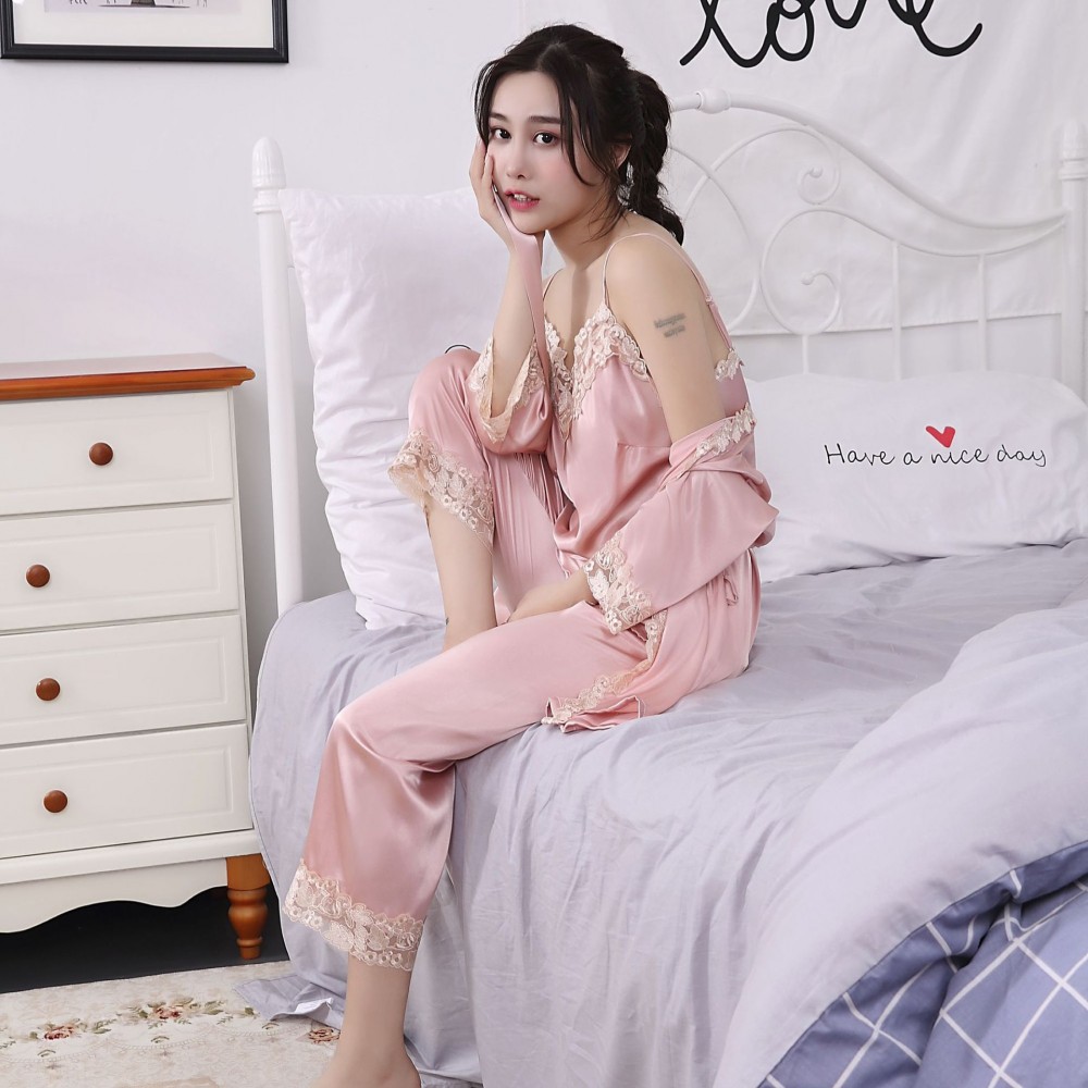 Spring and autumn summer ladies sexy simulation silk pajamas woman temptation sling three-piece home service suit CP