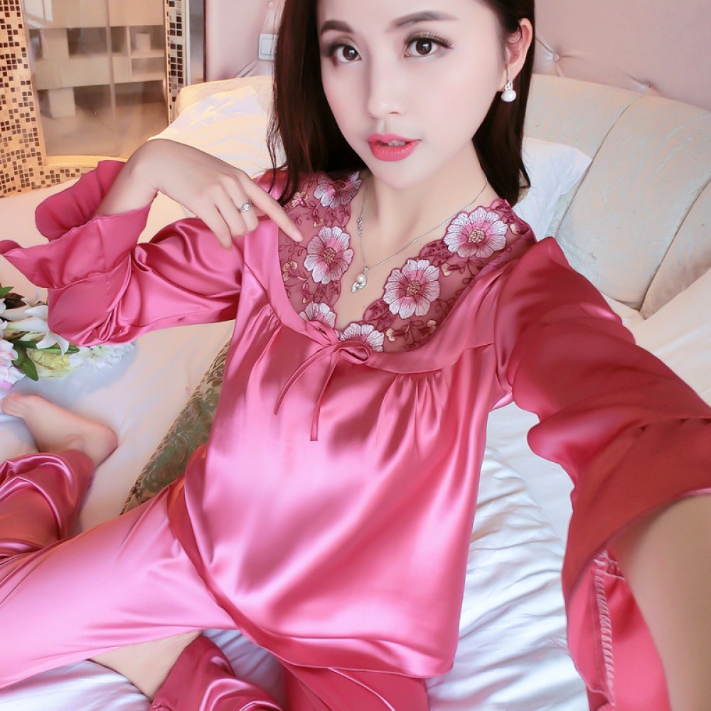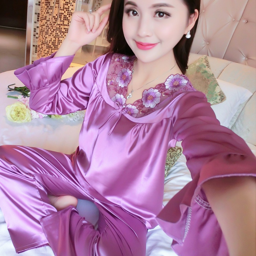 Spring and autumn winter pajamas female long-sleeved Korean version of the simulation silk suit ice silk XL home service can be worn outside