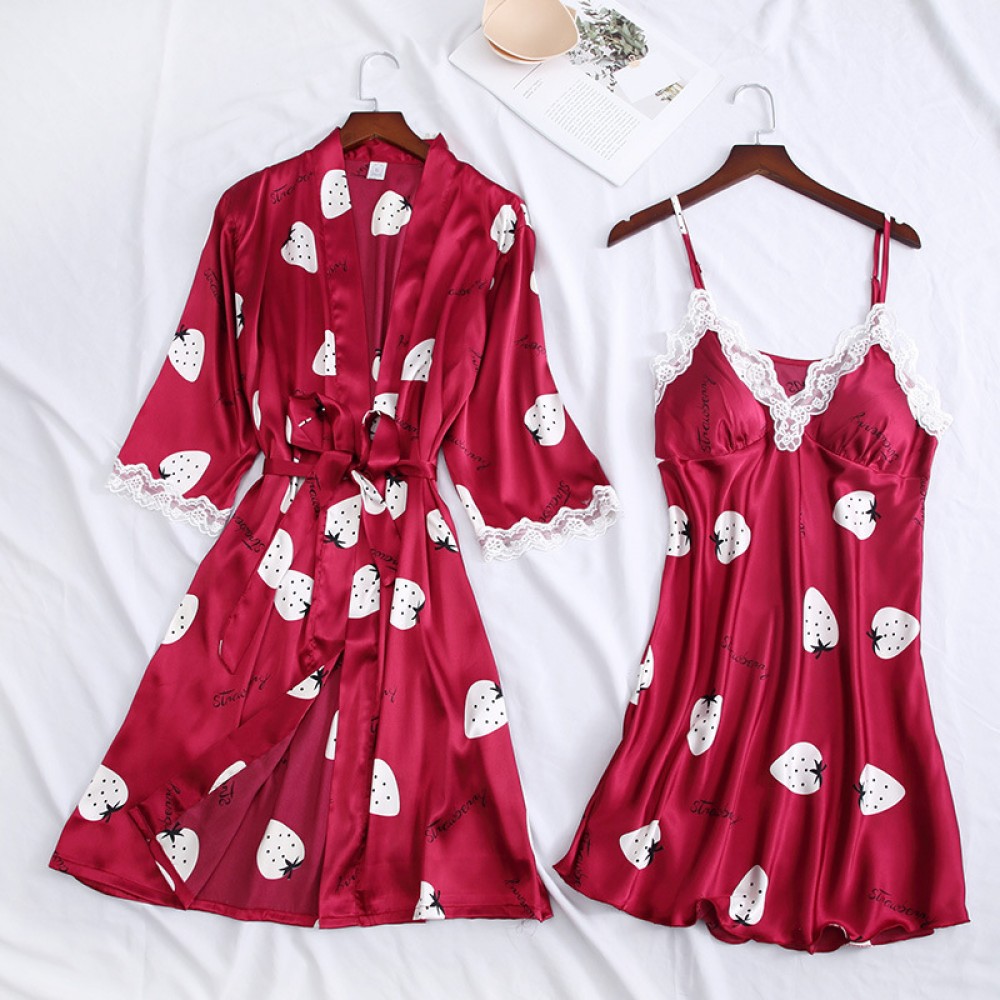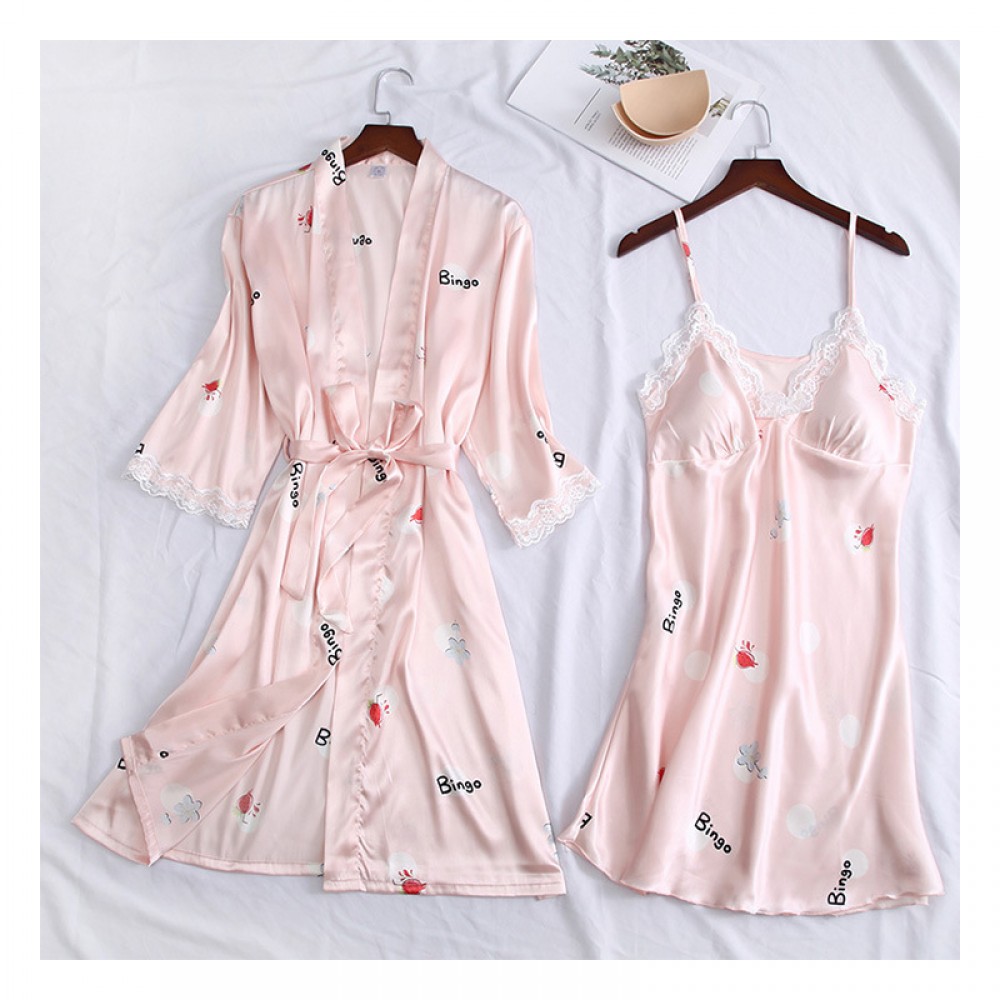 Spring and summer new simulation silk ladies cardigan lace robe mid-sleeved shorts nightgown ice silk printing four CP