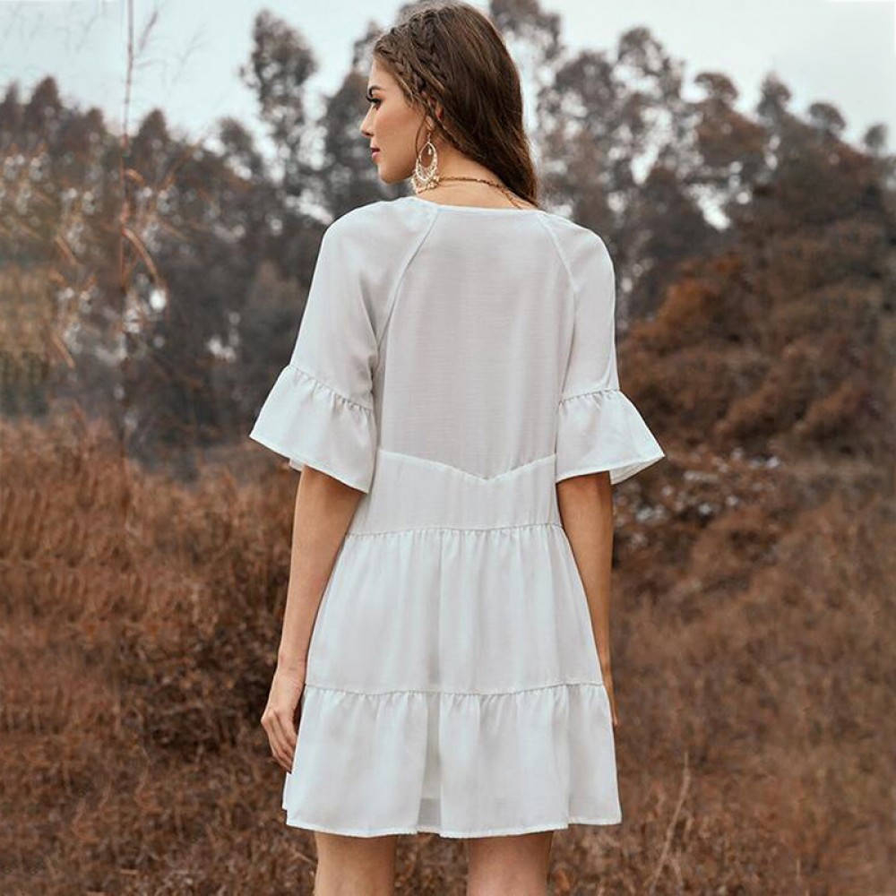 Spring and summer new solid color stitching ruffle fringed neckline lace trumpet sleeve dress