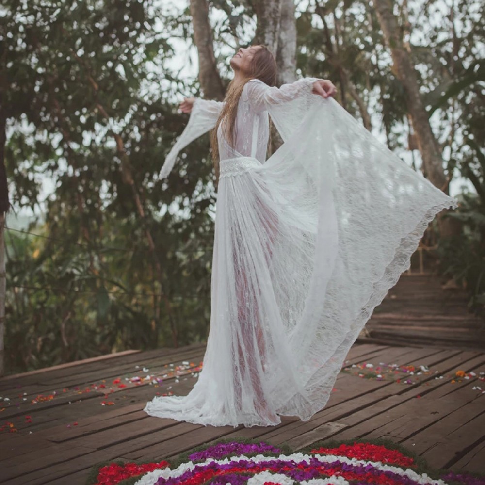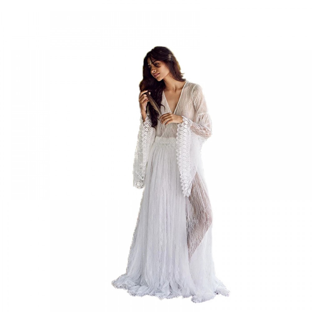 Spring and summer new transparent lace trumpet long-sleeved V-neck big swing sexy dress