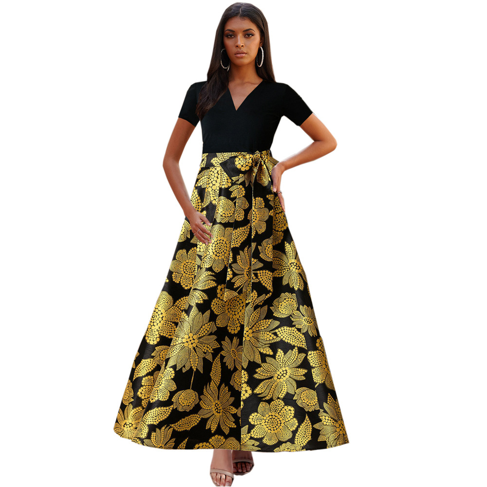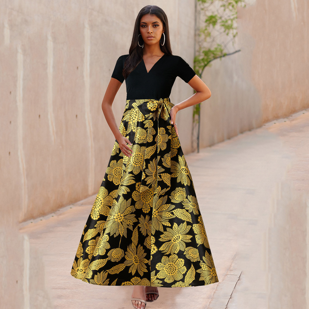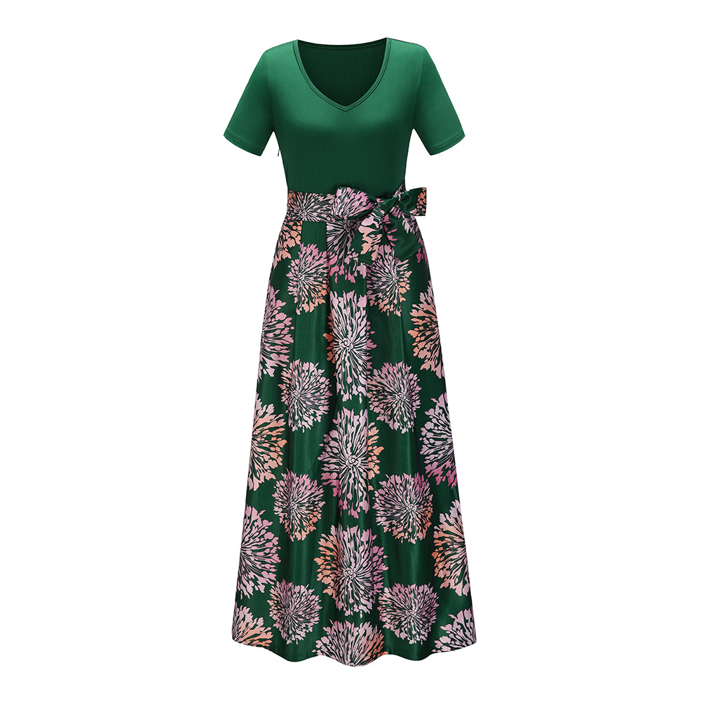 Spring and summer new women's skirt contrast color short-sleeved v-neck print dress dress
