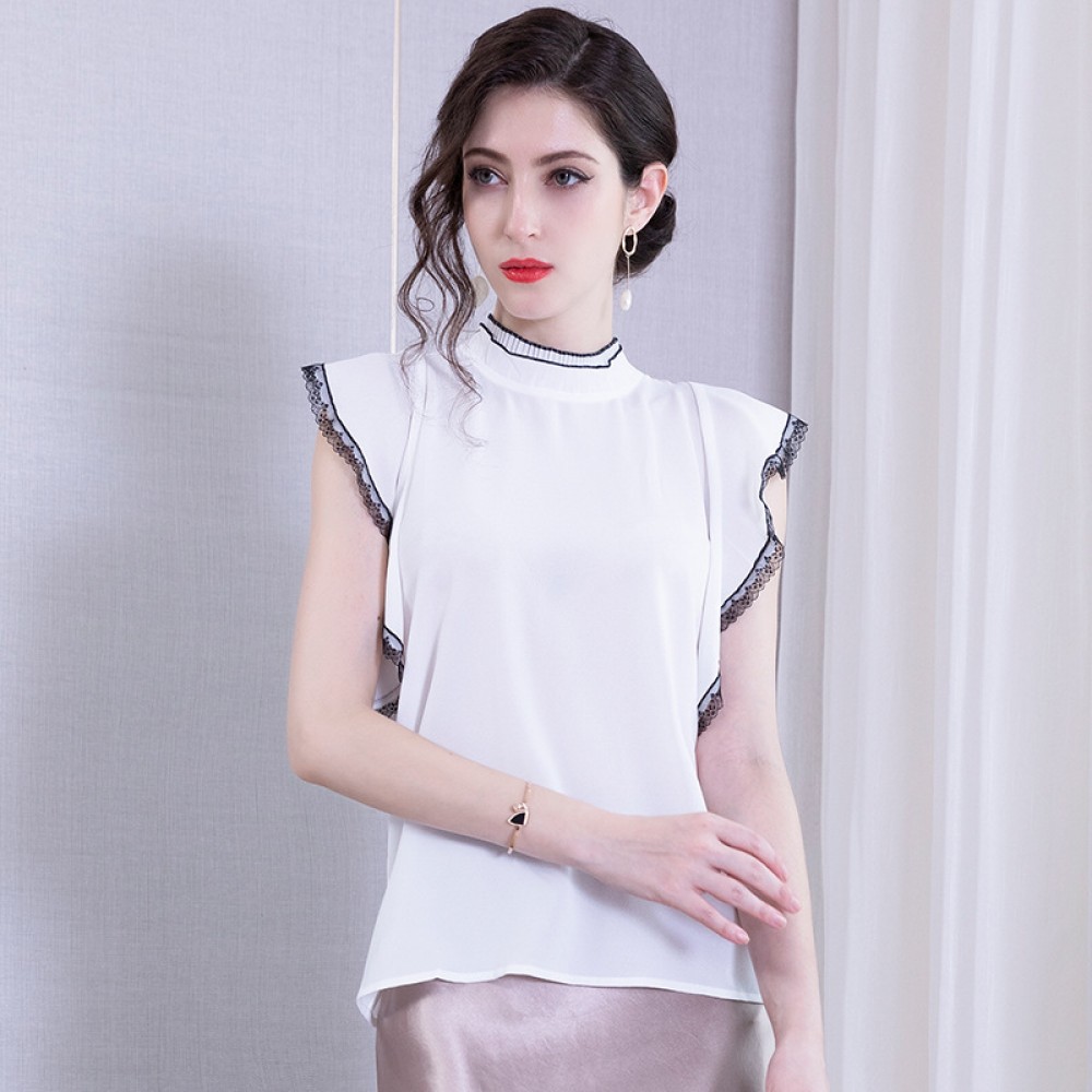 Spring New Chiffon Lotus Leaf Sleeve Lace Trim Shirt High Collar Elegant Solid Color Top Women
