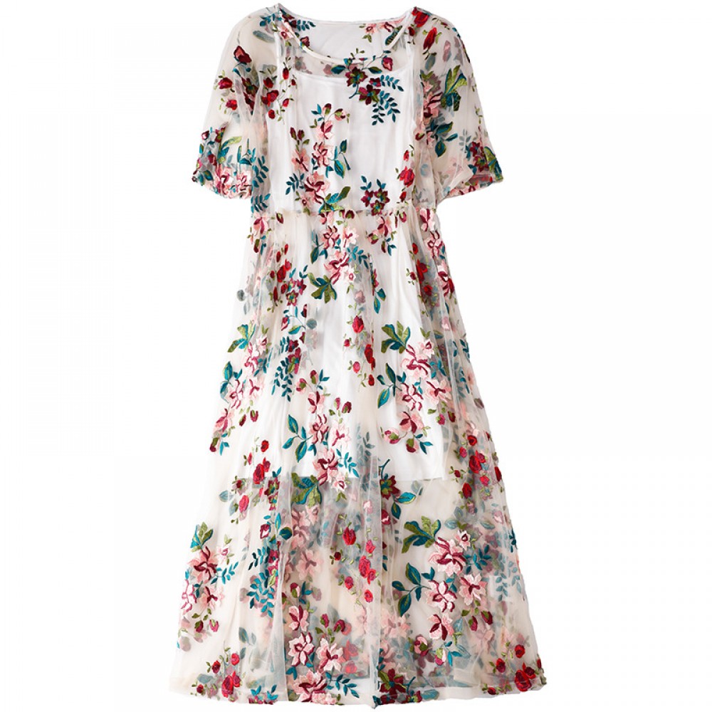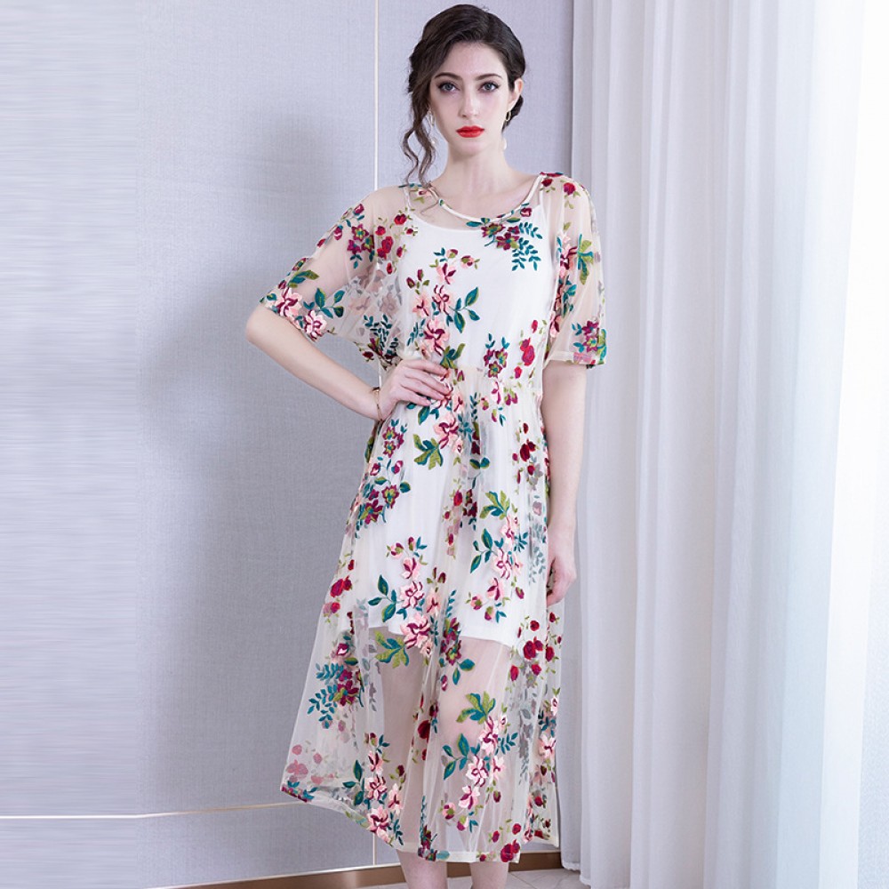 Spring new embroidery elegant round neck dress mid-sleeved chiffon long two-piece skirt