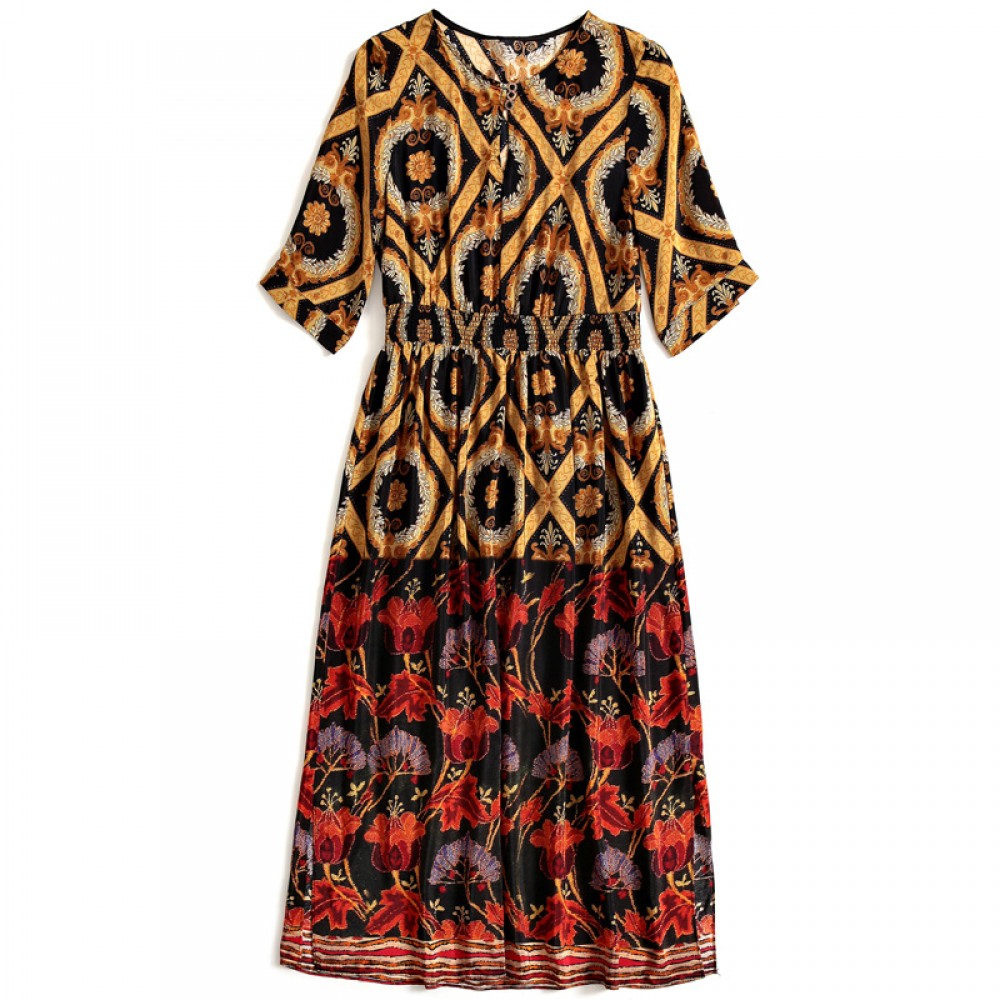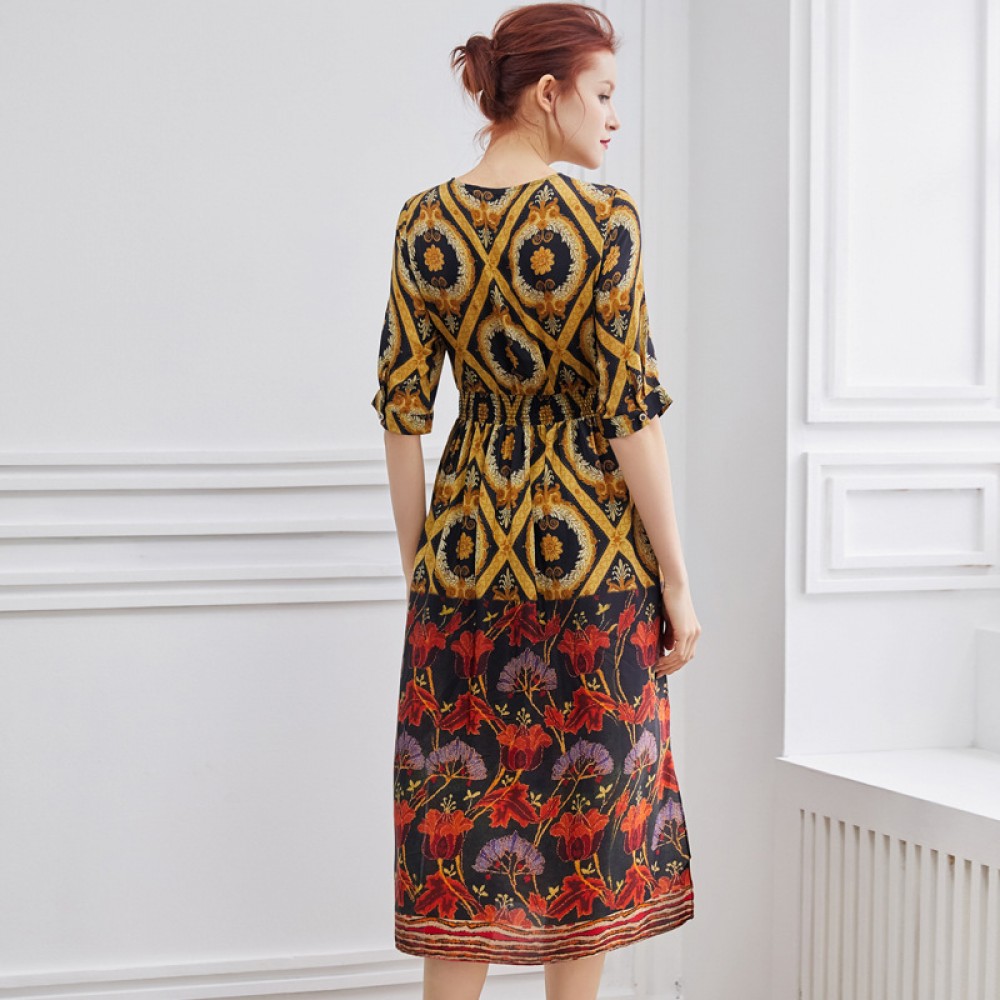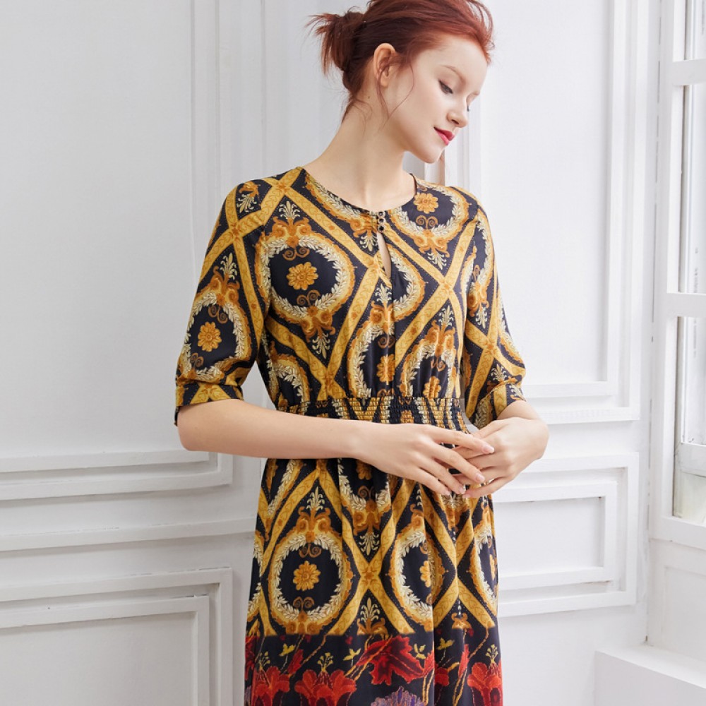 Spring new fashion silk temperament women's printed long-sleeved long waist dress