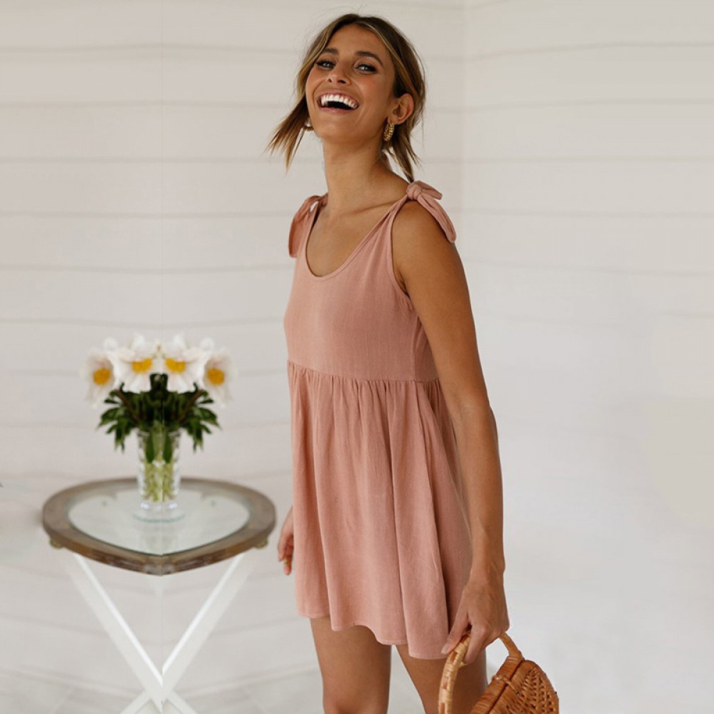 Spring New Round Neck Tie Strap Dress Swing Pleated Midi Skirt