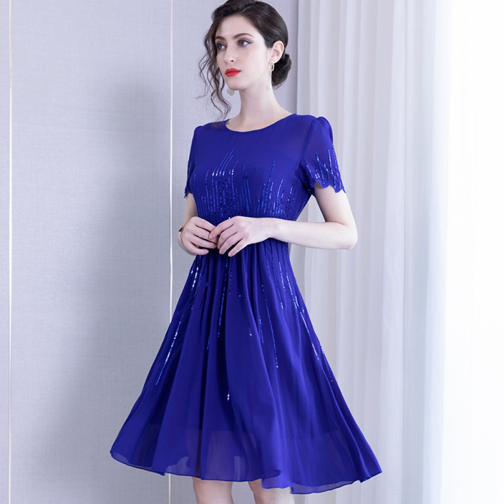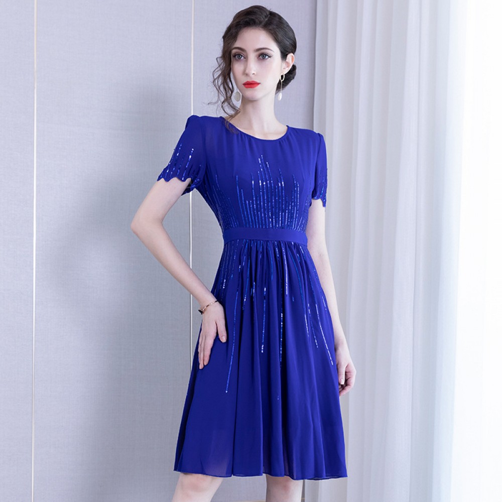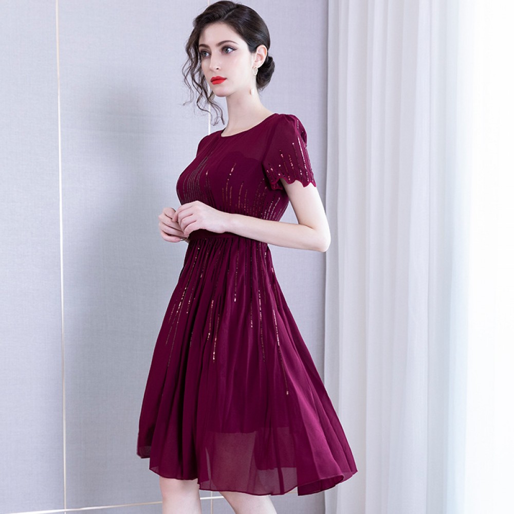 Spring new round neck waist skirt sequins pleated short-sleeved dress was thin and reduced age A-line skirt women
