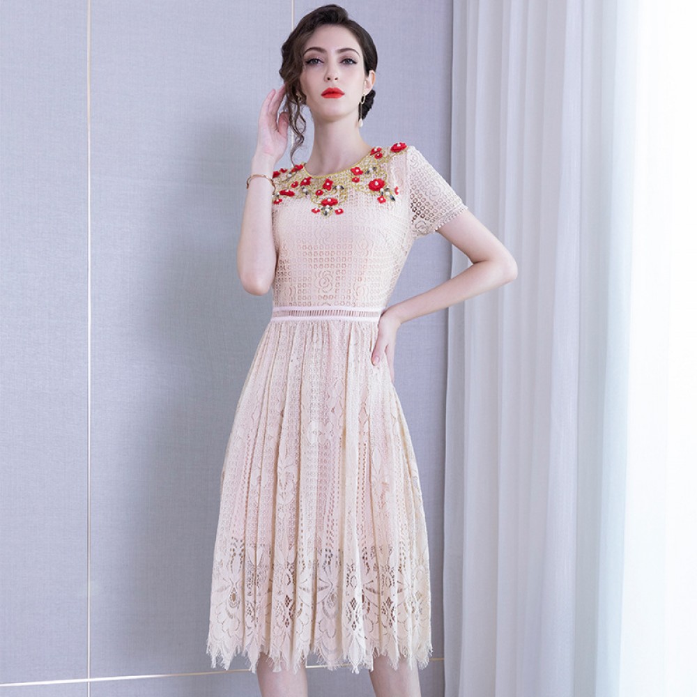 Spring temperament short-sleeved women's new embroidered applique beaded waist slim lace big swing dress