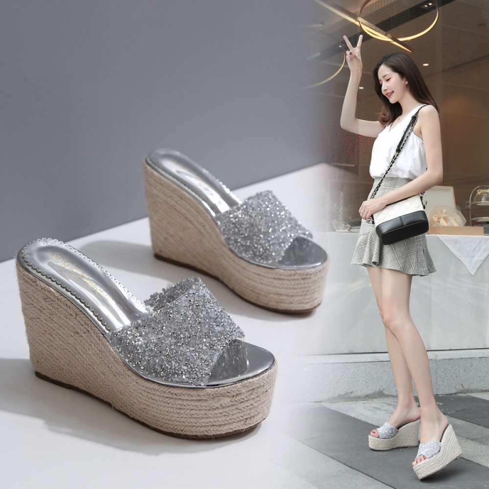 Summer 12CM high heel waterproof platform hemp rope wedge rhinestone slippers 313-5
