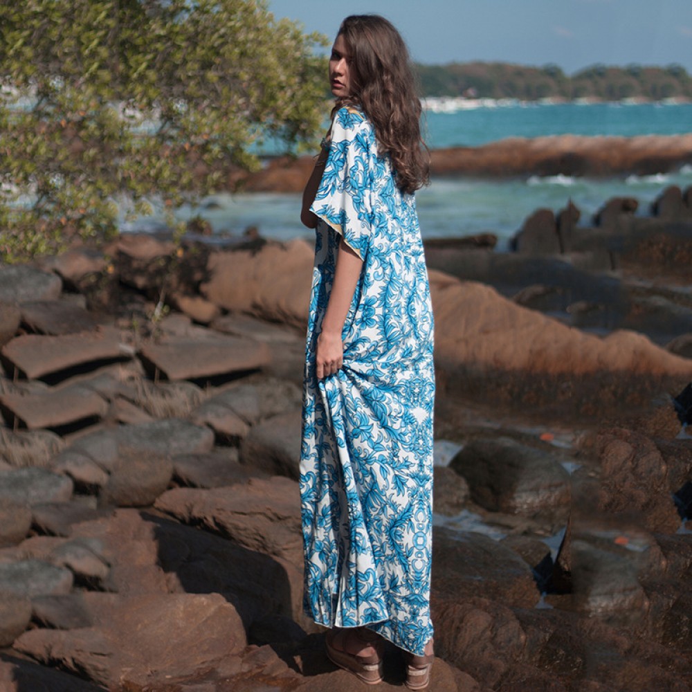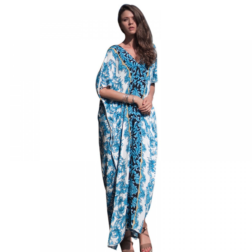 Summer dress printed V-neck bat sleeve long skirt female robe