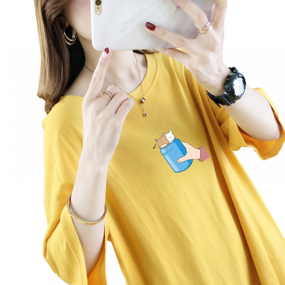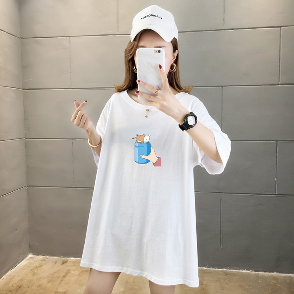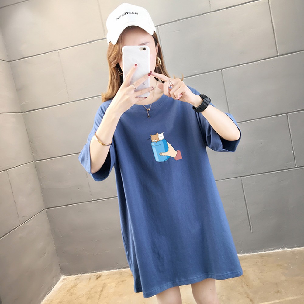 Summer new loose large size women's mid-length printed shirt solid color round neck short sleeve T-shirt female
