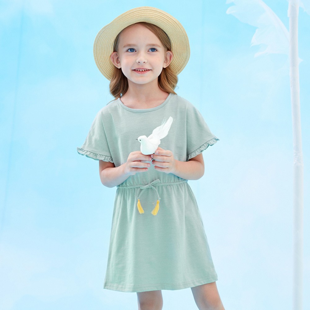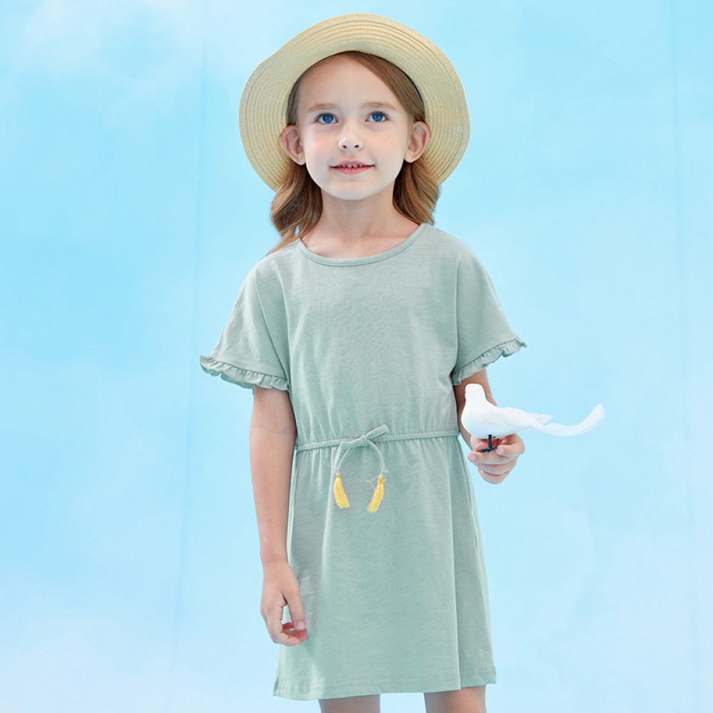 Summer new short-sleeved girls dress children's clothing lace cuffs waist waist color tassel T-shirt skirt