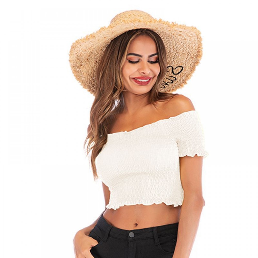 Summer new women's fashion fungus earrings T-shirt top word collar exposed navel short sleeves