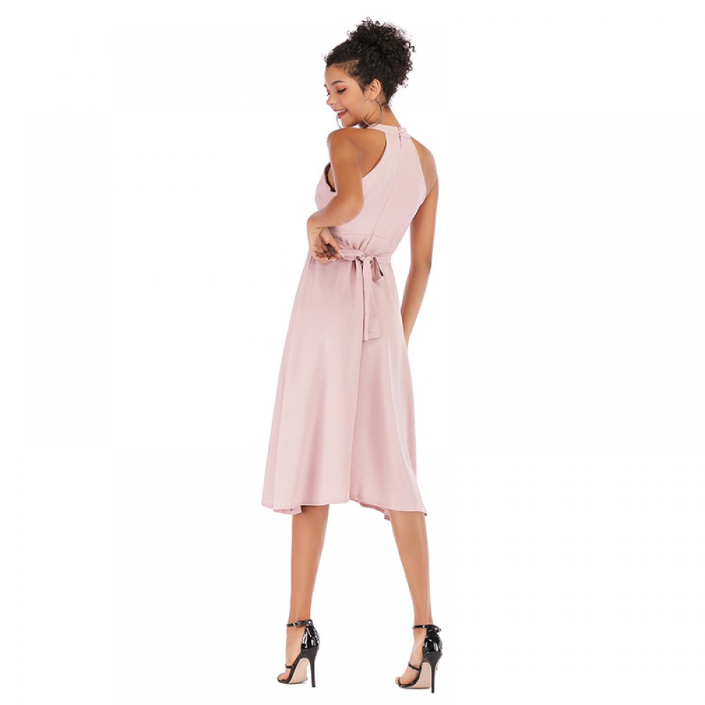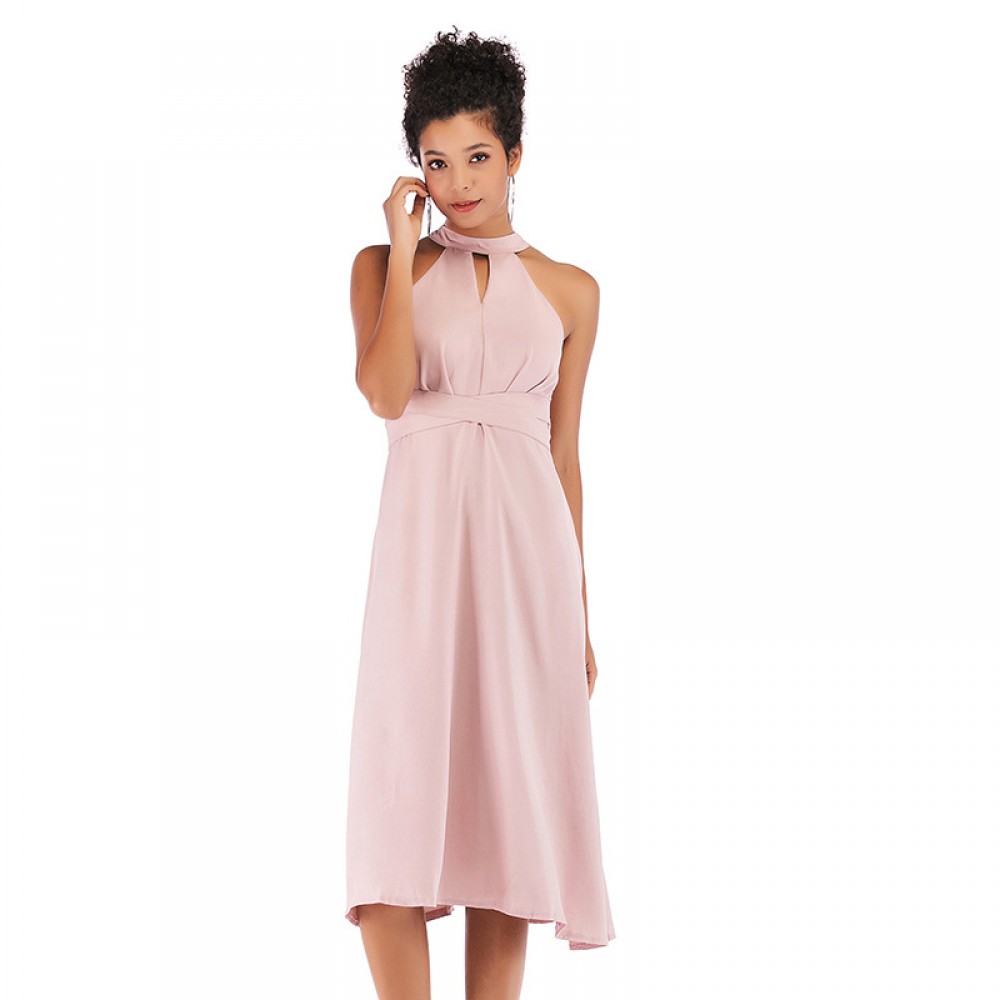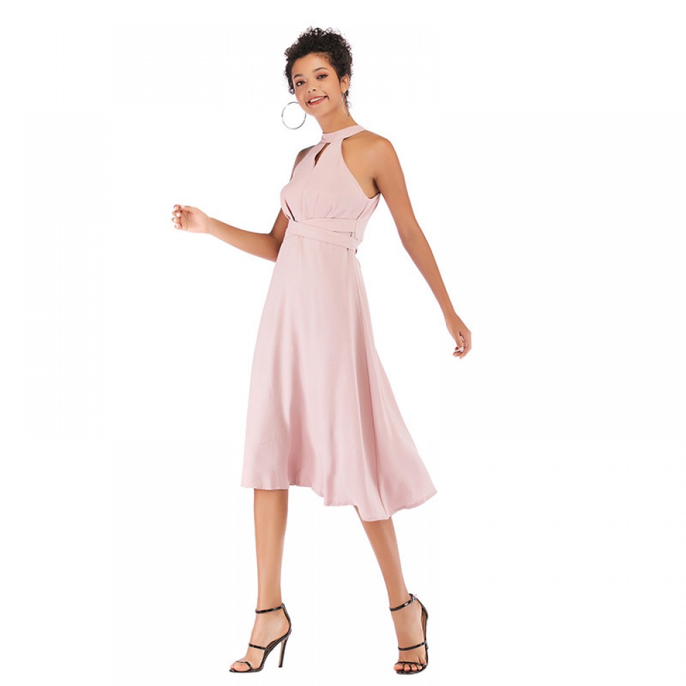 Summer pink hanging neck straps waist dress dress cutout long skirt
