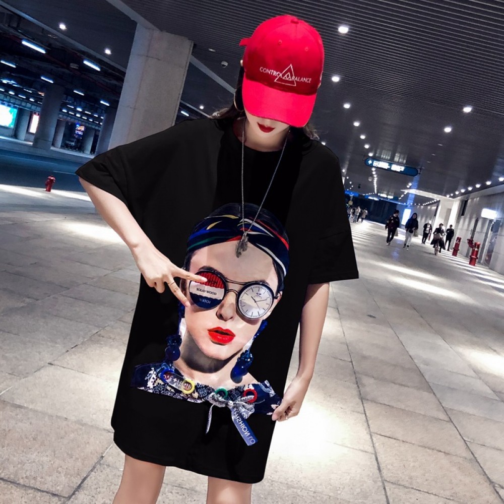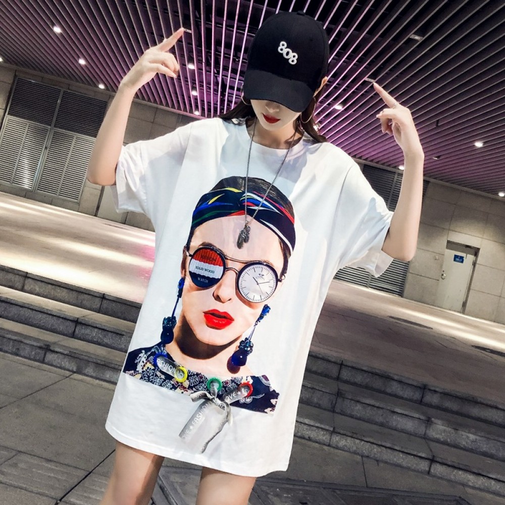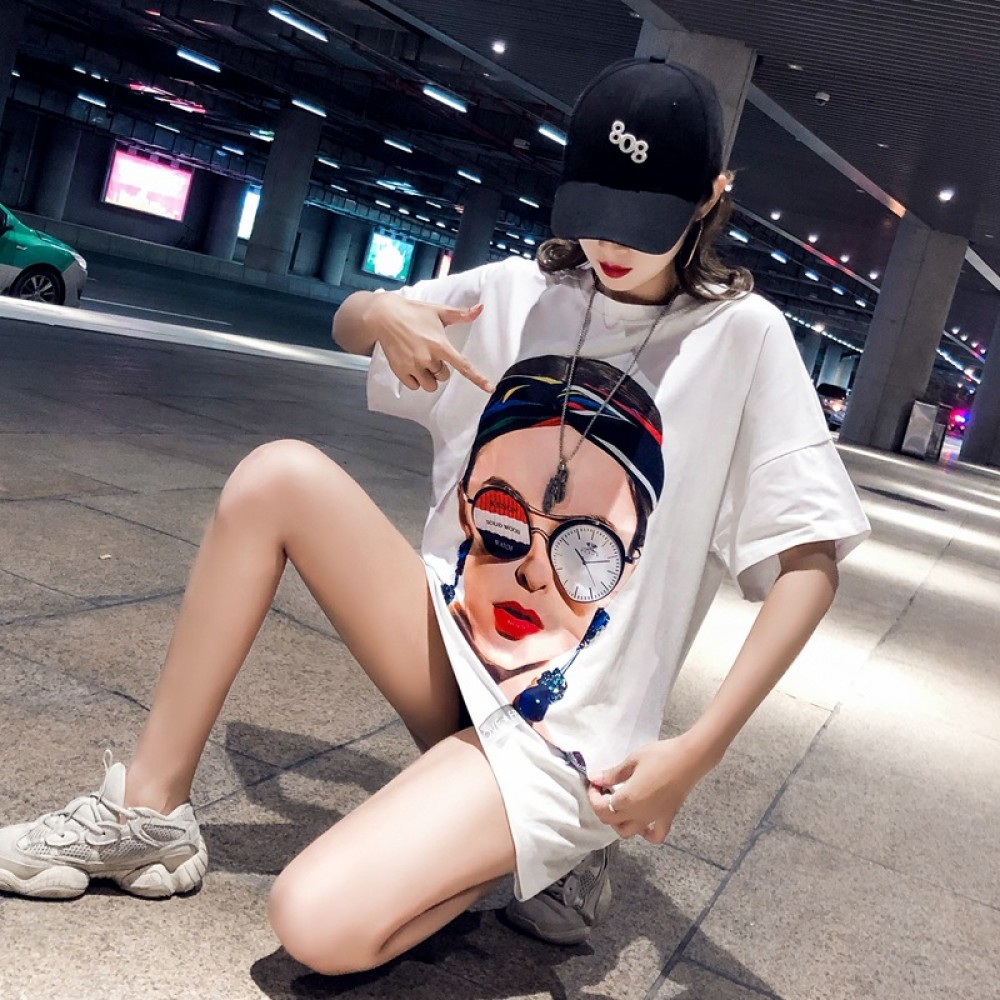 Summer style new personality short-sleeved t-shirt women loose large version of the long cartoon bottom missing shirt
