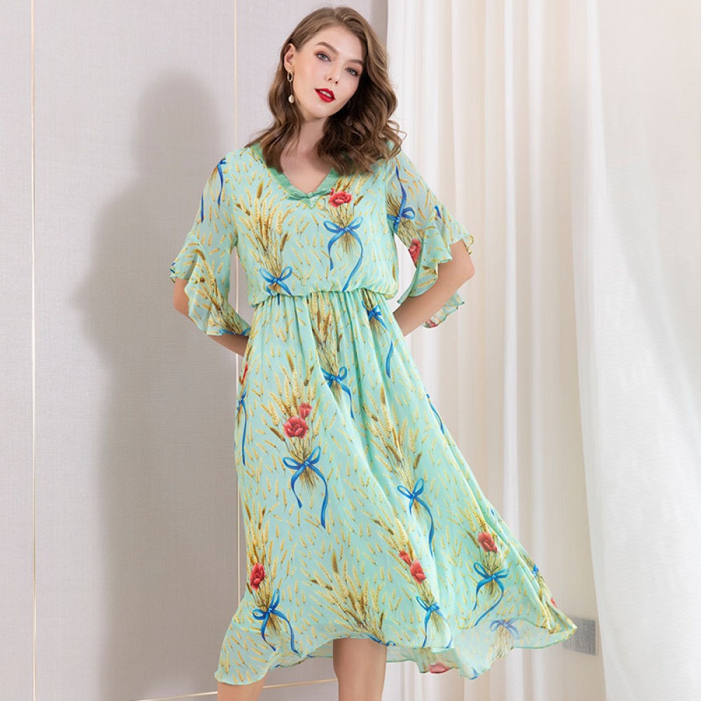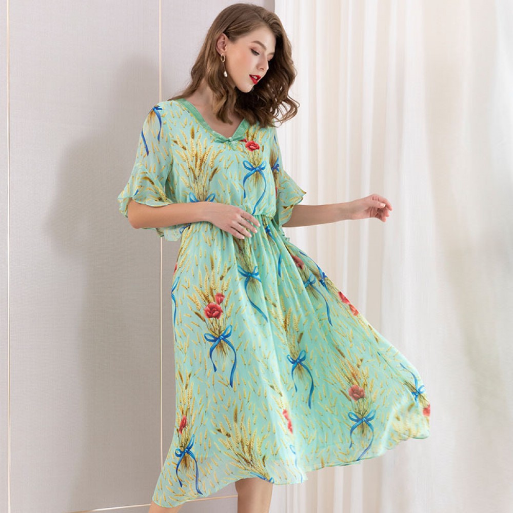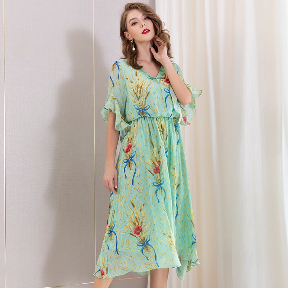 V-neck printed elasticated thin chiffon dress elegant irregular new summer