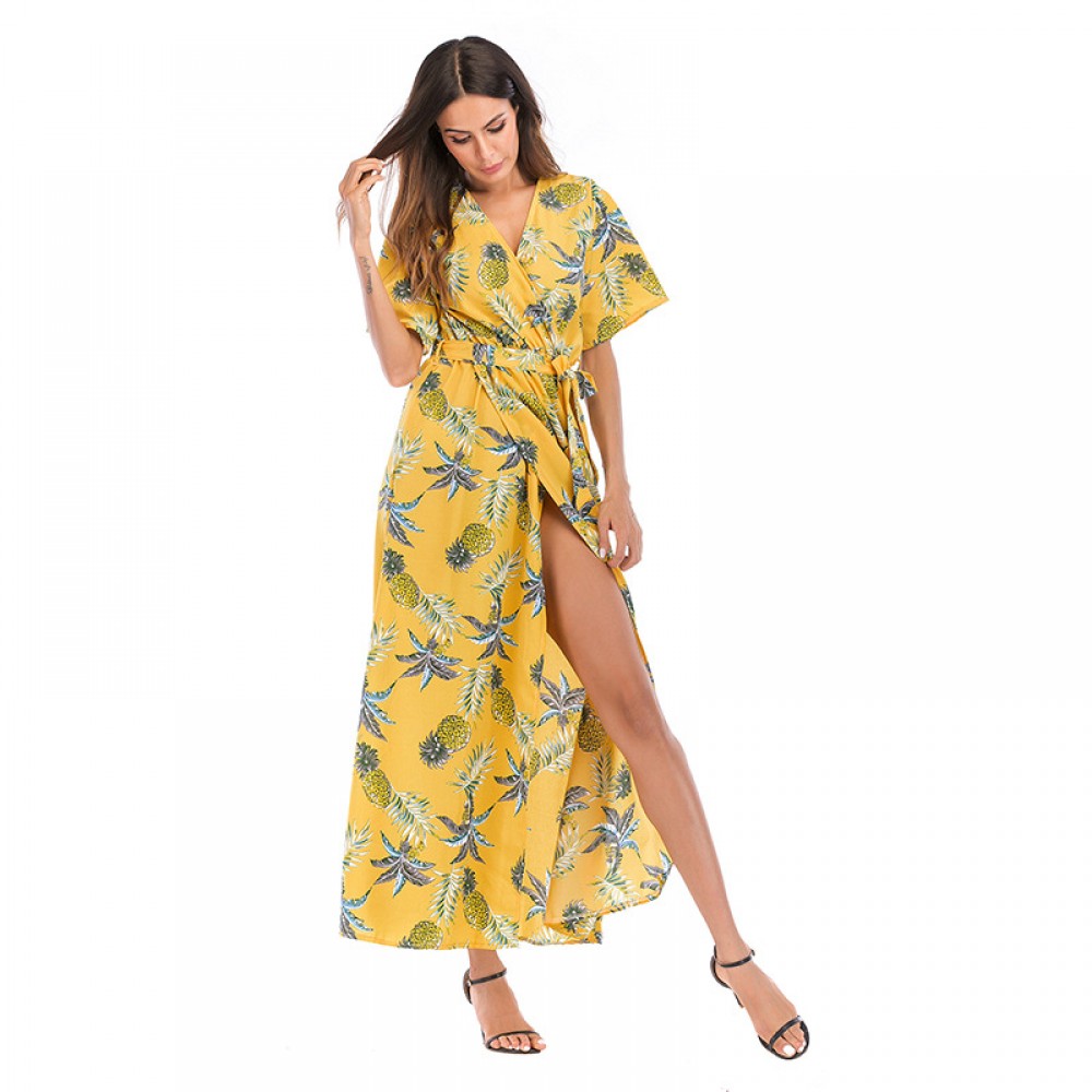 Women's long short-sleeved floral dress women's summer vacation beach skirt