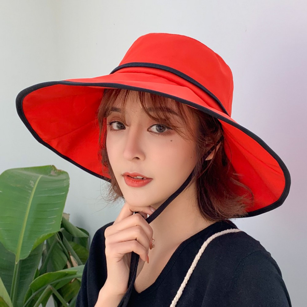 Women's outdoor sunscreen sunscreen fabric sun hat literary big brim hat summer new wild strap fisherman hat