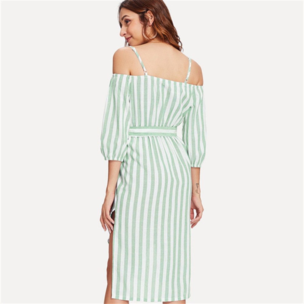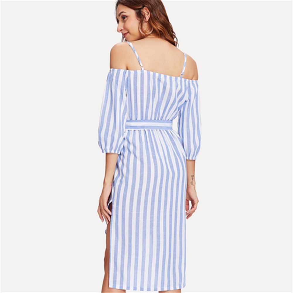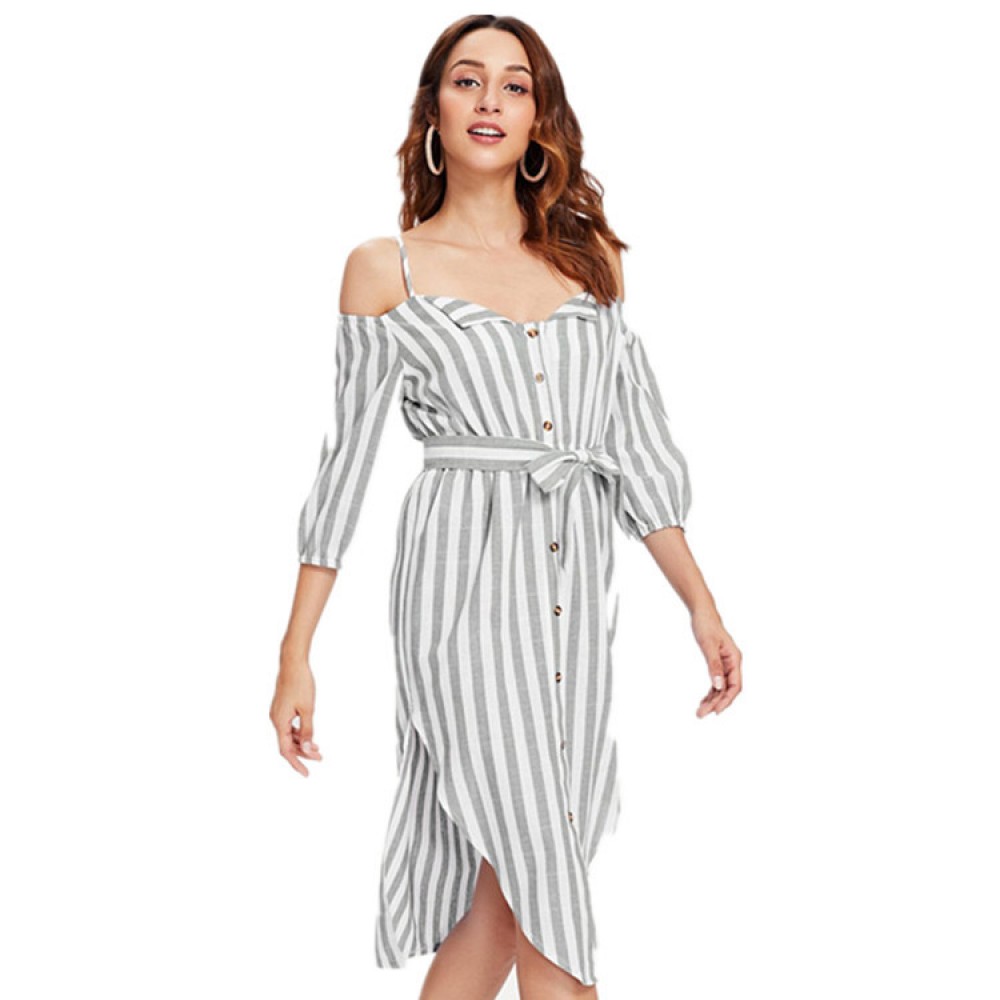 Women's Sling Leak Shoulder V-Neck Single-Breasted Long-Sleeve Hem Irregular Striped Dress