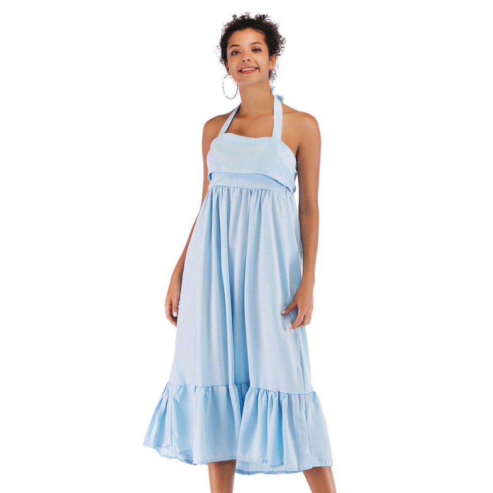 Women's solid color hanging neck ruffled skirt fashion temperament halter mid-length dress