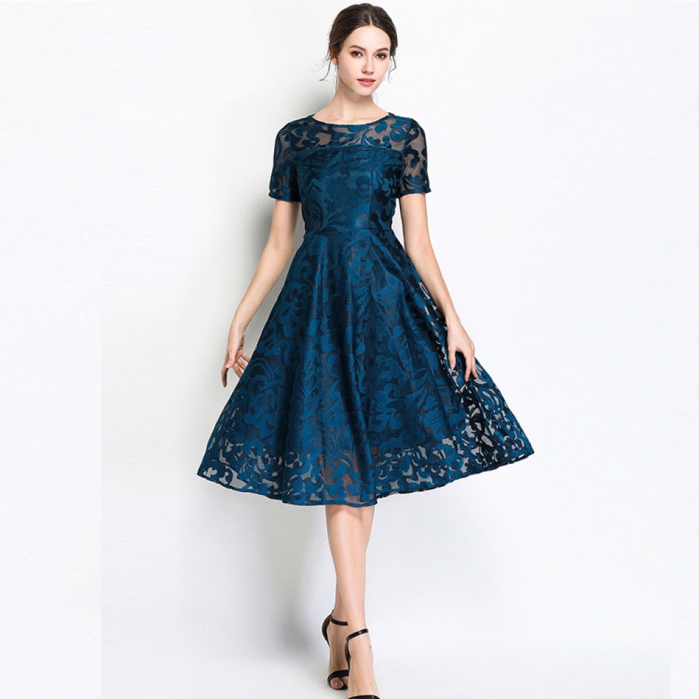 Xia's new large size women's fit body mesh lace dress was thin and versatile short-sleeved A-line skirt